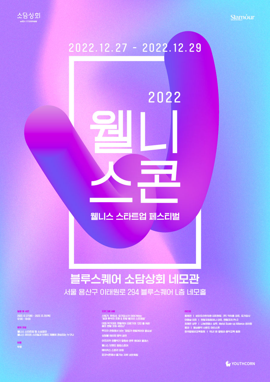 안녕하세요, 유스콘입니다! '2022 웰니스콘'은 웰니스 트렌드를 이끌어가는 메이커들과 건강한 라이프스타일을 추구하는 사람들이 모여 '지속가능한 삶'에 대한 이야기를 나누는 웰니스 스타트업 컨퍼런스입니다. 한 해를 마무리하면서 다양한 콘텐츠들을 즐기고, 다가올 내년을 위해 일과 삶을 조화롭게 이루어가는 방법에 대해 알아가는 시간을 가졌으면 합니다.
