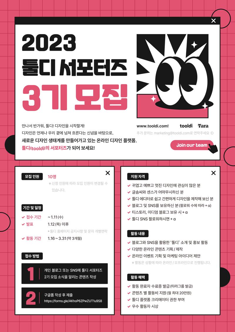 만나서 반가워, 툴디! 디자인을 시작할게! 디자인은 언제나 우리 곁에 넘쳐 흐른다는 신념을 바탕으로, 새로운 디자인 생태계를 만들어가고 있는 온라인 디자인 플랫폼, 툴디(tooldi)의 서포터즈가 되어 보세요!