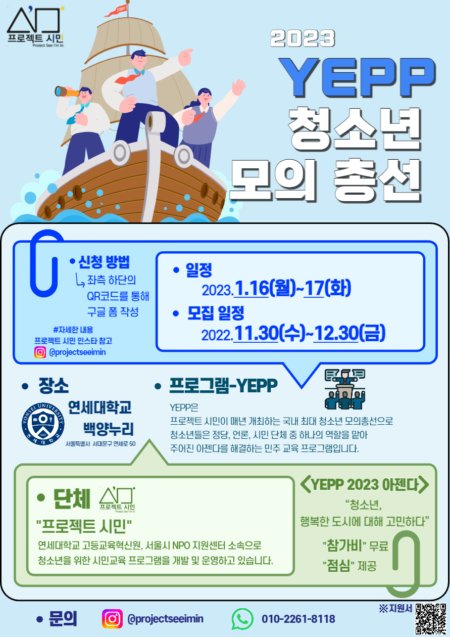 안녕하세요! 프로젝트 시민이 주최하는 YEPP 2023을 함께할 청소년 여러분들을 모집합니다!