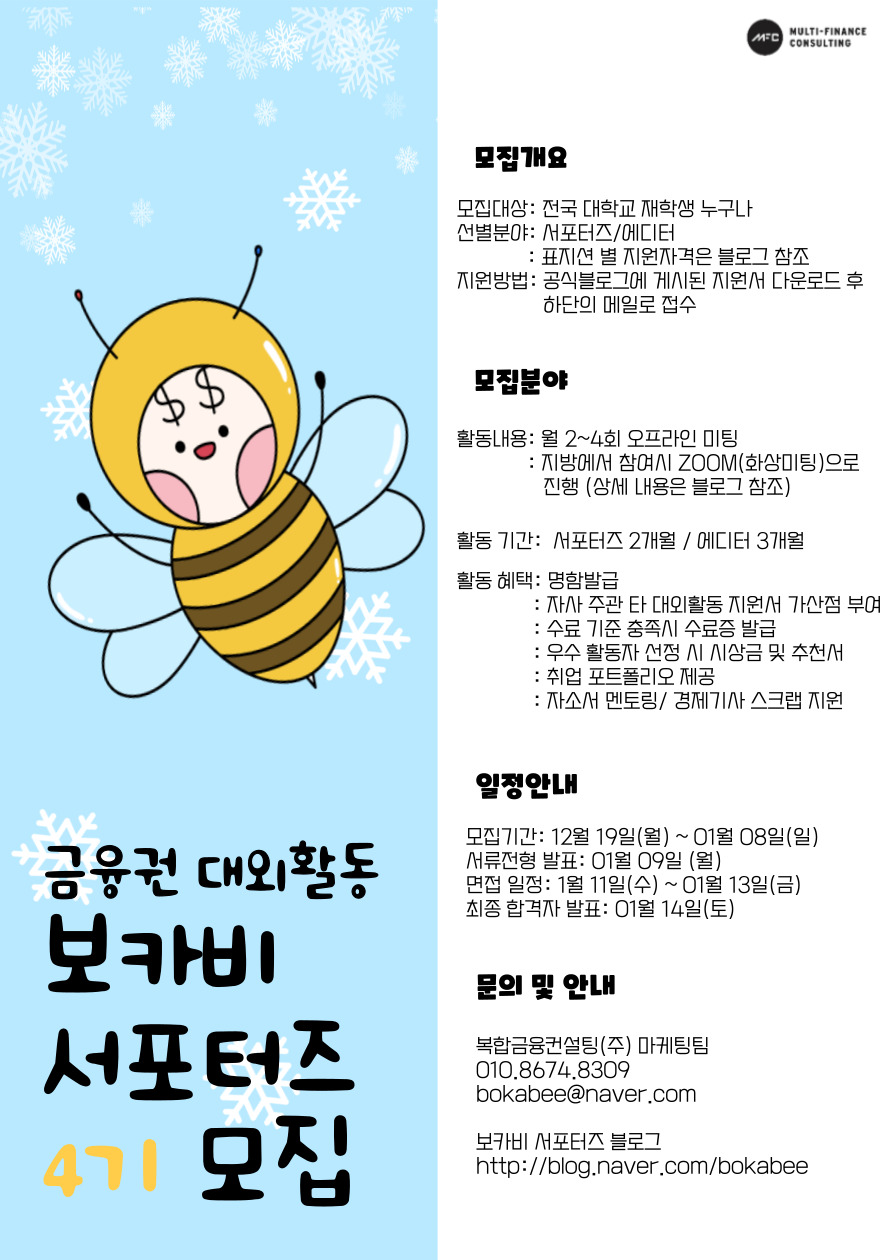 대학생 금융권 대외활동 모집 안내 보카비 서포터즈 4기 자소서, 면접! 취업을 위한 첫 관문의 Key는 본인만의 스토리라인입니다. MFC 복합금융컨설팅(주)에서 본인의 스토리라인을 함께 다져나갈 대학생 대외활동 보카비 서포터즈 4기를 모집합니다❗ 서류접수 기간: 2023년 1월 8일(일)까지 서류전형 발표: 2023년 1월 9일(월) 면접 일정: 2023년 1월 11일(수)\~2023년 1월 13일(금) 최종합격자 발표: 1월 14일(토) 활동혜택 1. 명함발급 2. 자사주관 타 대외활동 지원시 가산점 3. 수료기준(열심히 참여!) 충족시 수료증 발급 4. 우수활동자 시상금 5. 취업 포트폴리오 6. 자소서 멘토링(희망자) 7. 경제기사 스크랩 제공 상세내용 및 지원 방법은 보카비 공식블로그 참고해주시기를 바랍니다! 많은 관심과 지원 부탁드립니다! https://blog.naver.com/bokabee/222959866916