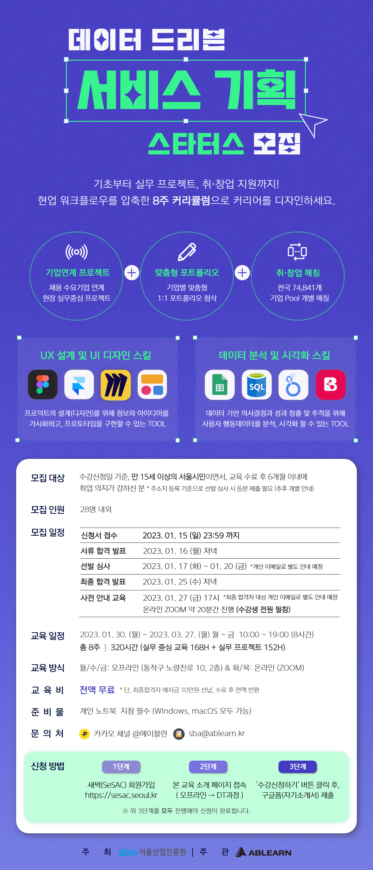 ○ 1단계 : SBA 새싹 홈페이지 회원가입 후, '(동작1기) UI/UX부터 실무 프로젝트까지, 데이터 기반 서비스 기획 스쿨' 과목 [수강신청] 버튼 누르기