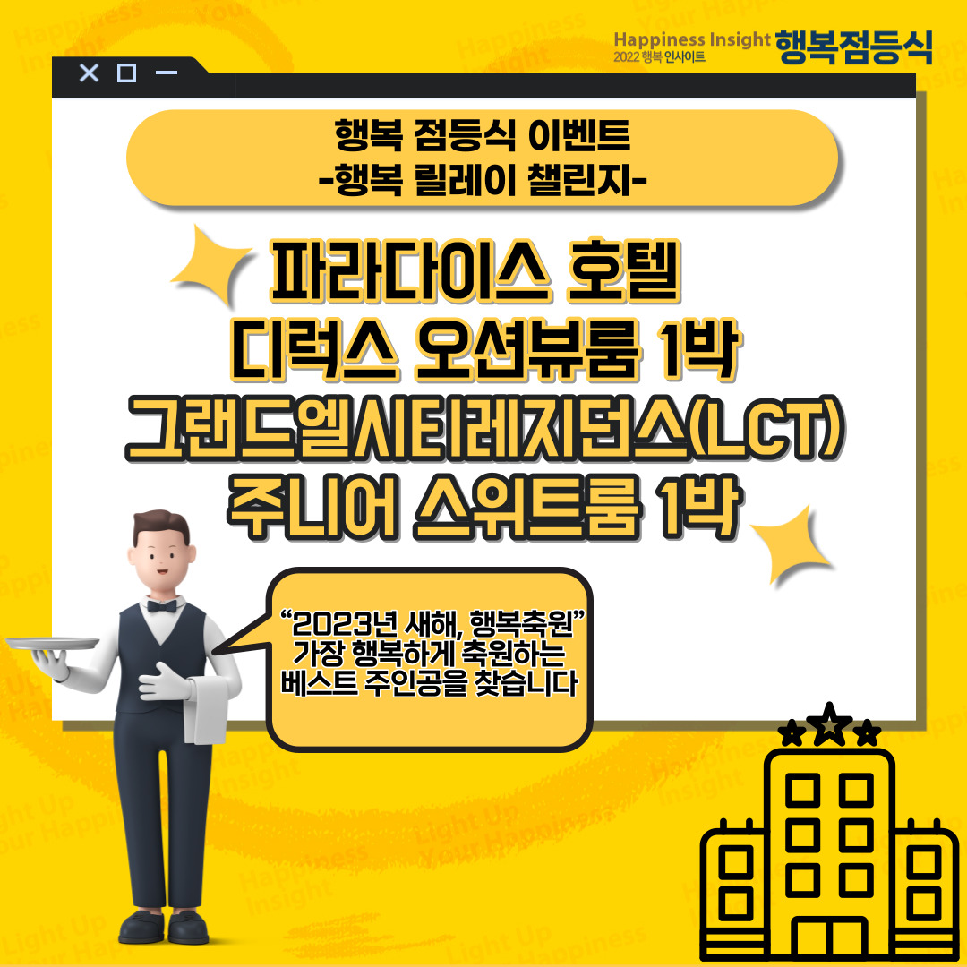🌟"2023년 새해, 행복축원"🌟 안녕하세요 행복인사이트 사무국입니다! 이번 행복 점등식을 진행하면서 저희가 <행복 릴레이 챌린지>라는 이벤트를 진행하게 되었습니다. 행복 챌린지 영상을 촬영하여 [happiness@leeconvention.com]으로 보내주시길 바랍니다.
