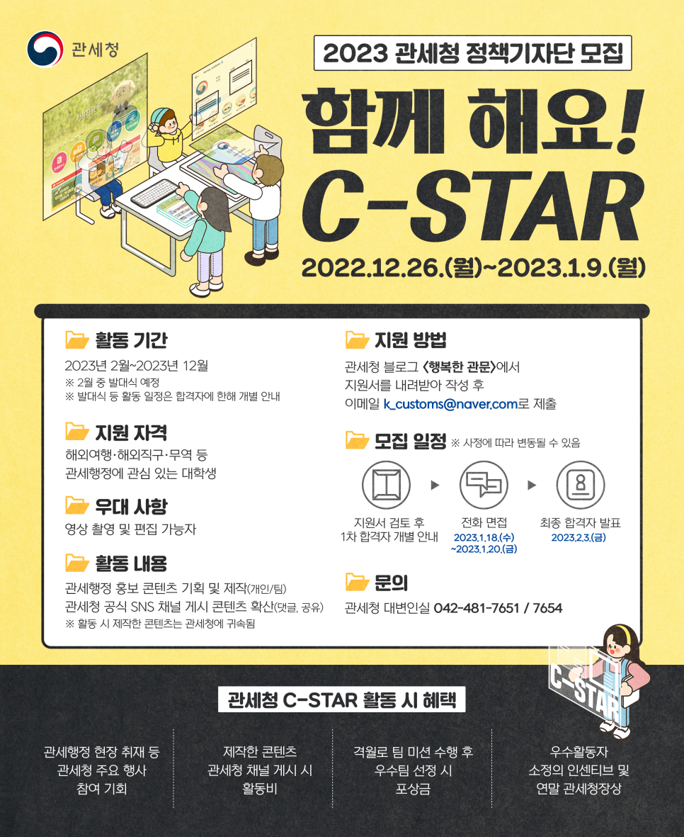 대한민국 관세국경의 수호자인 관세청에서 생생한 관세 현장의 소식과 관세 정책을 쉽고 재미있게 전할 사람들인 C-STAR 9기를 모집합니다.