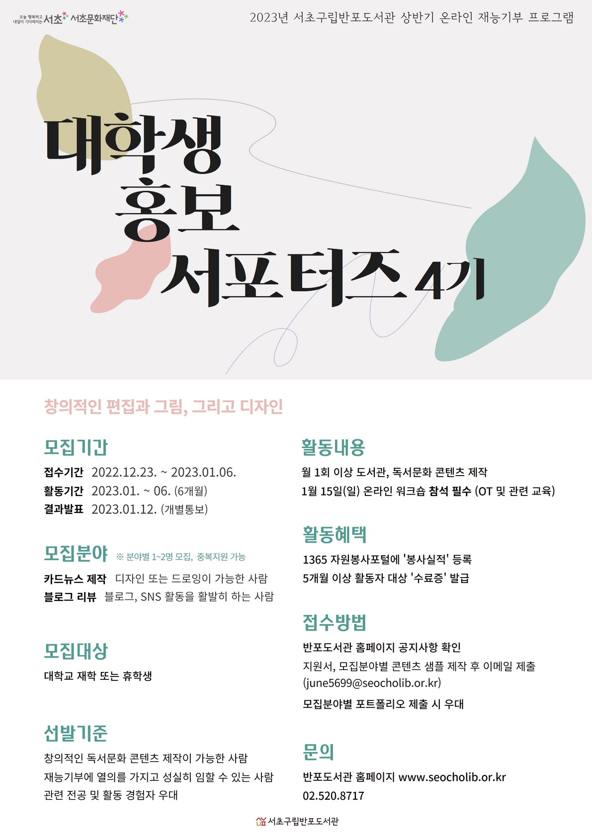2023년 상반기 서초구립반포도서관 대학생 홍보 서포터즈 3기 모집
