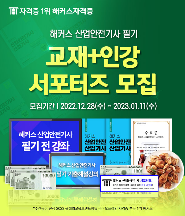 해커스자격증의 산업안전기사 베스트셀러 1위 교재와 강의만족도 99.7% 강의를 무료로 체험해보실 수 있는 [해커스 산업안전기사 필기 교재+인강 서포터즈]를 모집합니다.