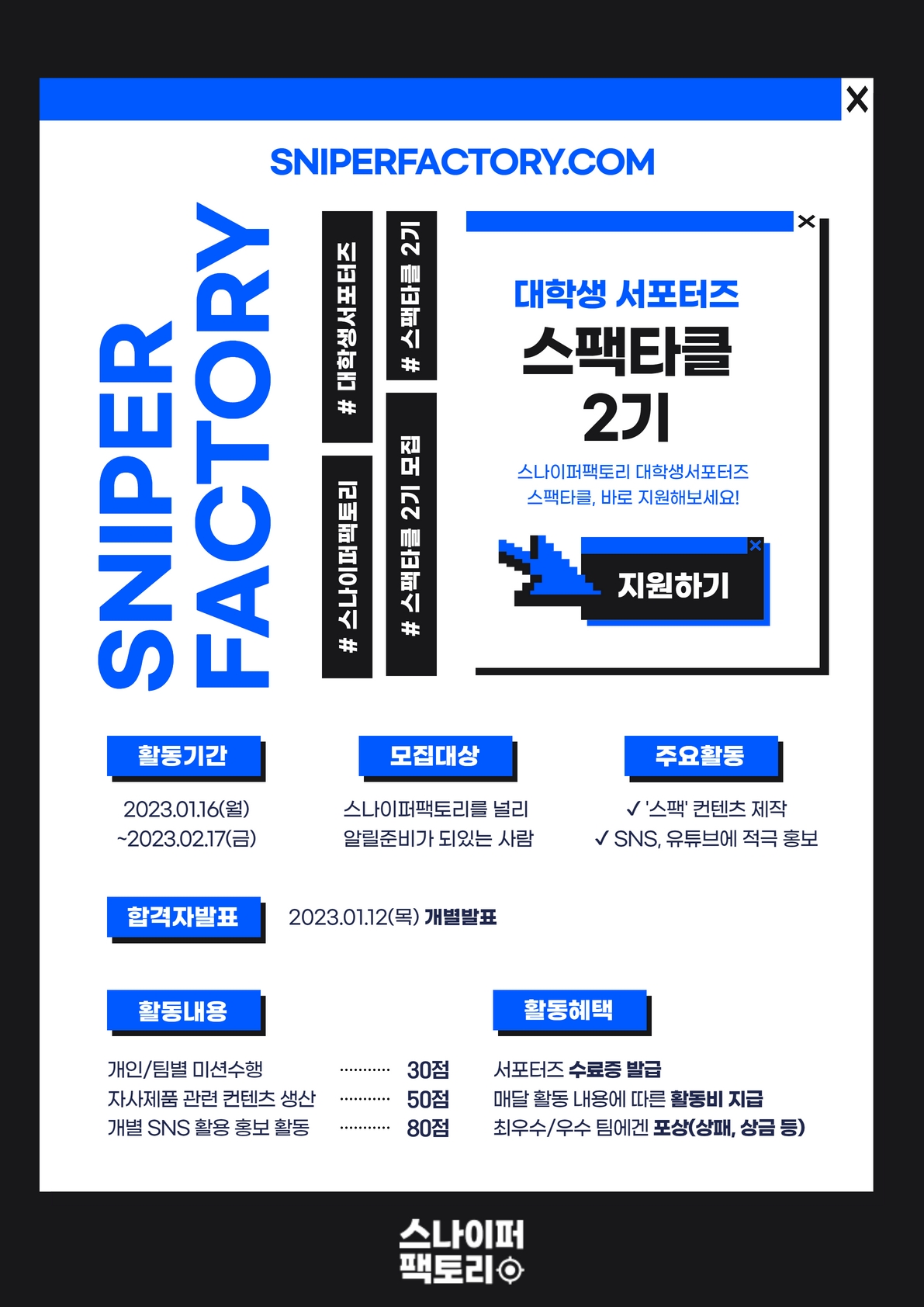 서포터즈에게 많은 기회와 혜택을 드리고자 하며, 추후 서포터즈만의 커뮤니티 등 스나이퍼팩토리 서포터즈만이 누릴 수 있는 기회를 제공합니다!