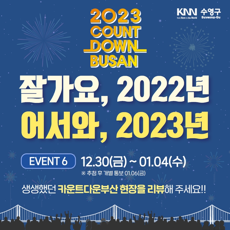 ☞ 이벤트 참여는? ① '2023 카운트다운부산' 오프라인 또는 온라인 참여하기 ② 개인 SNS에 참여 인증 업로드하기 (사진or동영상) ③ 공식 계정 태그하기 "countdownbusan" ④ 이벤트폼 (게시물 링크 첨부) 작성 후 제출하기