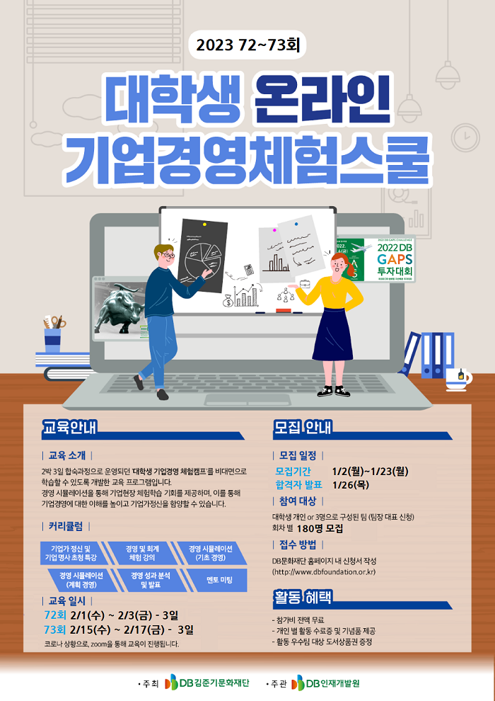 [DB김준기문화재단] 72\~73회 대학생 온라인 기업경영 체험스쿨 참가자 모집 경영 시뮬레이션으로 기업경영의 하나부터 열까지 체험할 수 있는 프로그램이 있다면?! 코로나19 걱정없이 내집에서 부담없이 안전하게 참여할 수 있다면?! 온라인으로 자기계발과 취업준비를 한번에! 기업경영 체험스쿨! 그 동안 대학생들의 많은 사랑을 받았던 DB그룹의 '대학생 기업경영 체험캠프'가 비대면 화상교육 프로그램인 '대학생 온라인 기업경영 체험스쿨'로 새롭게 태어났습니다! 대학생 여러분들의 많은 관심과 참여 바랍니다. ■ 어떤 사람이 참여하면 좋나요? 기업에 취직할 때 도움이 될 대외활동을 하고싶어요! 첫 대외활동으로 기업과 관련된 활동을 통해 여러 사람들과 교류하고 싶어요! 기업에서 주관하는 대외활동을 통해 기업경영과 실무에 대해 배우고 싶어요! 재학생과 휴학생도 학기 중 온라인으로 참여할 수 있는 대외활동을 찾고 있어요! ■ 언제, 어디서 하나요? - 일시: 72회 2/1(수)\~2/3(금) - 3일 73회 2/15(수)\~2/17(금) – 3일 (1일차 15:00\~18:00 / 2,3일차 09:30\~18:00) - 장소: ZOOM 화상교육 - 대상: 기업체 취직을 희망하거나 기업 경영 활동에 관심이 있는 대학생 (개인 또는 팀(3명) 신청) - 모집인원: 180명 (총60팀) ■ 어떻게 신청하나요? - 신청접수: 2023.1.2(월)\~2023.1.23(월) - 접수방법: DB문화재단 홈페이지(링크) 공지사항의 모집공고에서 교육참가 신청서 작성 (https://www.dbfoundation.or.kr/) - 대상자 발표: 2023. 1. 26(목) * 대상자 발표 후 참가등록 절차를 거쳐 참가여부 확정 ■ 참가하면 어떤 혜택이 있나요? ① 참가자 교육비 전액 무료 ② 교육 수료자 전원 수료증 및 기념품 제공 ③ 학습 우수팀 소정의 도서상품권 증정 ■ 캠프에 대해 궁금한 것이 있어요! - Tel: 02-3011-5544 \| e-mail: intern@dbgroup.co.kr * 자세한 캠프 내용은 DB김준기문화재단 홈페이지나 기존 참가자 후기(블로그 등)를 통해 확인하실 수 있습니다.