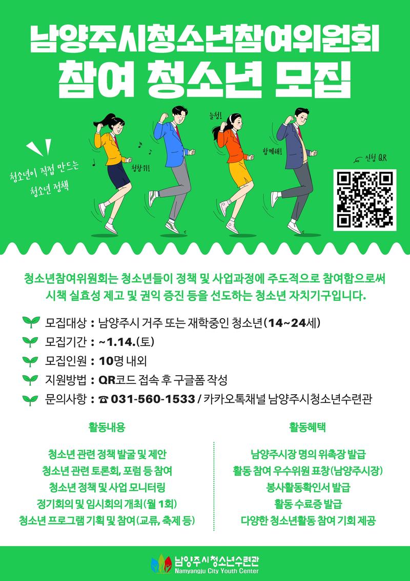 남양주시청소년수련관에서는 남양주시 청소년들을 자치단체 정책 및 사업과정에 주체적으로 참여토록 함으로써 지역청소년 시책의 실효성 제고 및 권익 증진을 도모하기 위한 남양주시 청소년참여위원회 ‘제23기 늘푸른청소년위원회’ 신입위원을 모집합니다.