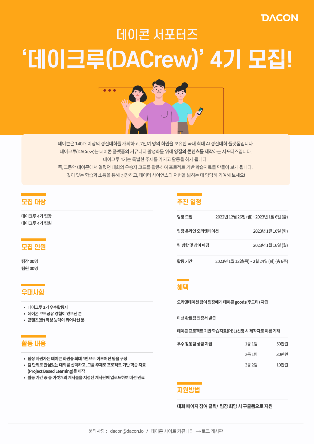 ○ 활동내용 데이콘은 140개 이상의 대회를 개최하고, 7만여 명의 회원을 보유한 국내 최대 AI 경진대회 플랫폼입니다. 데이크루(DACrew)는 데이콘 플랫폼 커뮤니티의 활성화를 위해 양질의 컨텐츠를 제작하는 서포터즈입니다. 데이크루 4기는 특별한 주제를 가지고 활동을 하게 됩니다. 즉, 그동안 데이콘에서 열렸던 대회의 데이터를 활용하여 프로젝트 기반 학습 자료를 만들어 보게 됩니다. 깊이 있는 학습과 소통을 통해 성장하고, 데이터 사이언스의 저변을 넓히는 데 당당히 기여해 보세요!