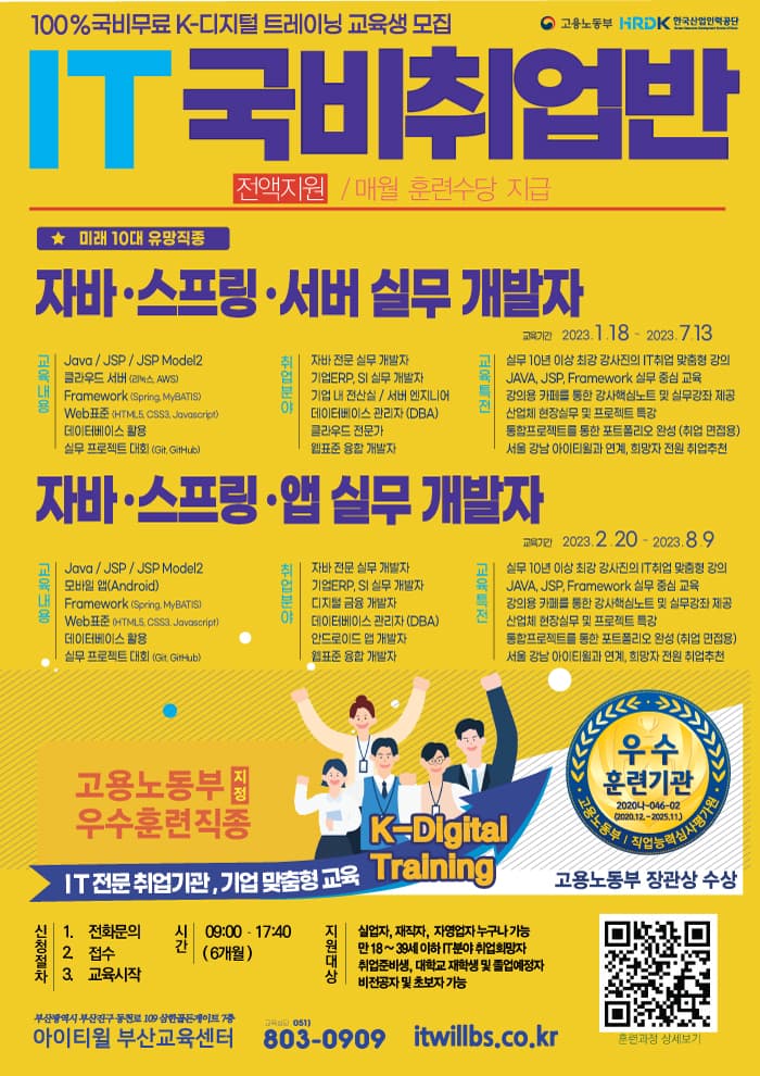 고용노동부 우수훈련기관 아이티윌 부산교육센터 "IT취업교육" 훈련생 모집! ★아이티윌 수강특전★ 국가직무능력표준(NCS)를 기반으로 한 NCS 인증 교육과정 서울 강남 아이티윌과 연계, 희망자 전원 취업 추천 실력향상을 위한 온라인 IT 교육 제공 담임제를 통한 주기적인 상담 및 사후관리 센터 운영 카페를 통한 강사핵심노트 및 최신 시험정보 제공 통합 실무프로젝트롤 통한 포트폴리오 완성 ∨ 교육신청 바로가기 https://itwillbs.co.kr/cmn/cnsl/atnl/cnslMain.do ∨ 수강후기 바로가기 https://itwillbs.co.kr/cmn/atnlnRvw/BBSMSTR_000000000042/hrdrvatnlnRvwList.do ■ 교육과정 및 교육일정 자바·스프링·서버 개발자 취업반 1/18\~7/13 자바·스프링·앱 개발자 취업반 2/20\~8/9