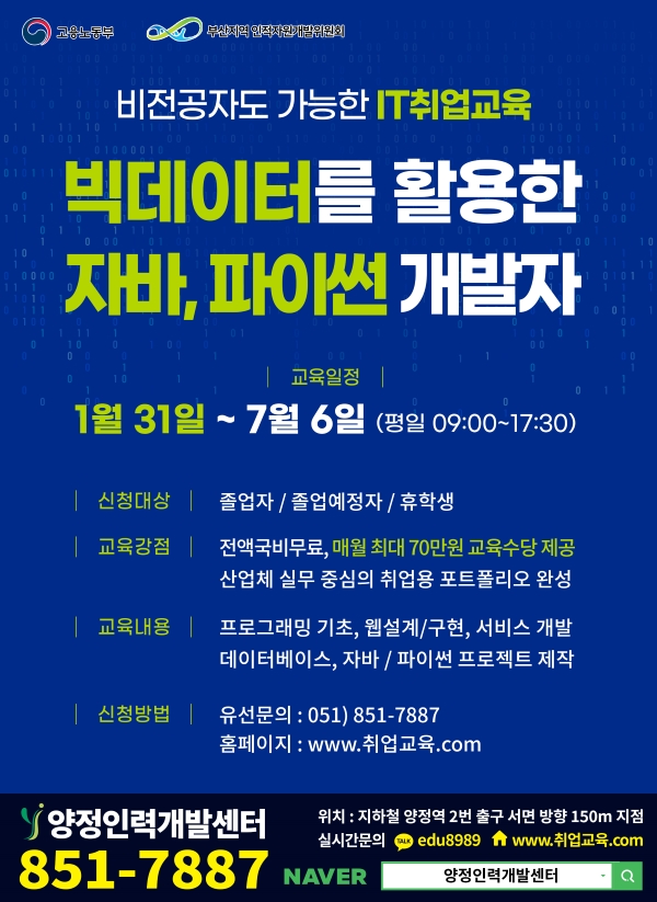 [양정인력개발센터] 2023 고용노동부 5년 인증 우수훈련기관 선정! 비전공자 가능/취업용 포트폴리오 제작 프로젝트 강화형 개발자 교육 듣고 IT 취업하자!