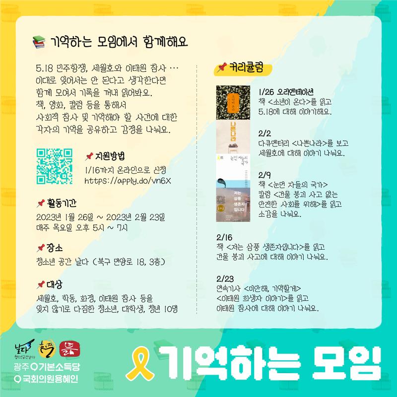 📂대상 : 세월호, 학동, 화정, 이태원 참사 등을 잊지 않기로 다짐한 청소년, 대학생, 청년 10명