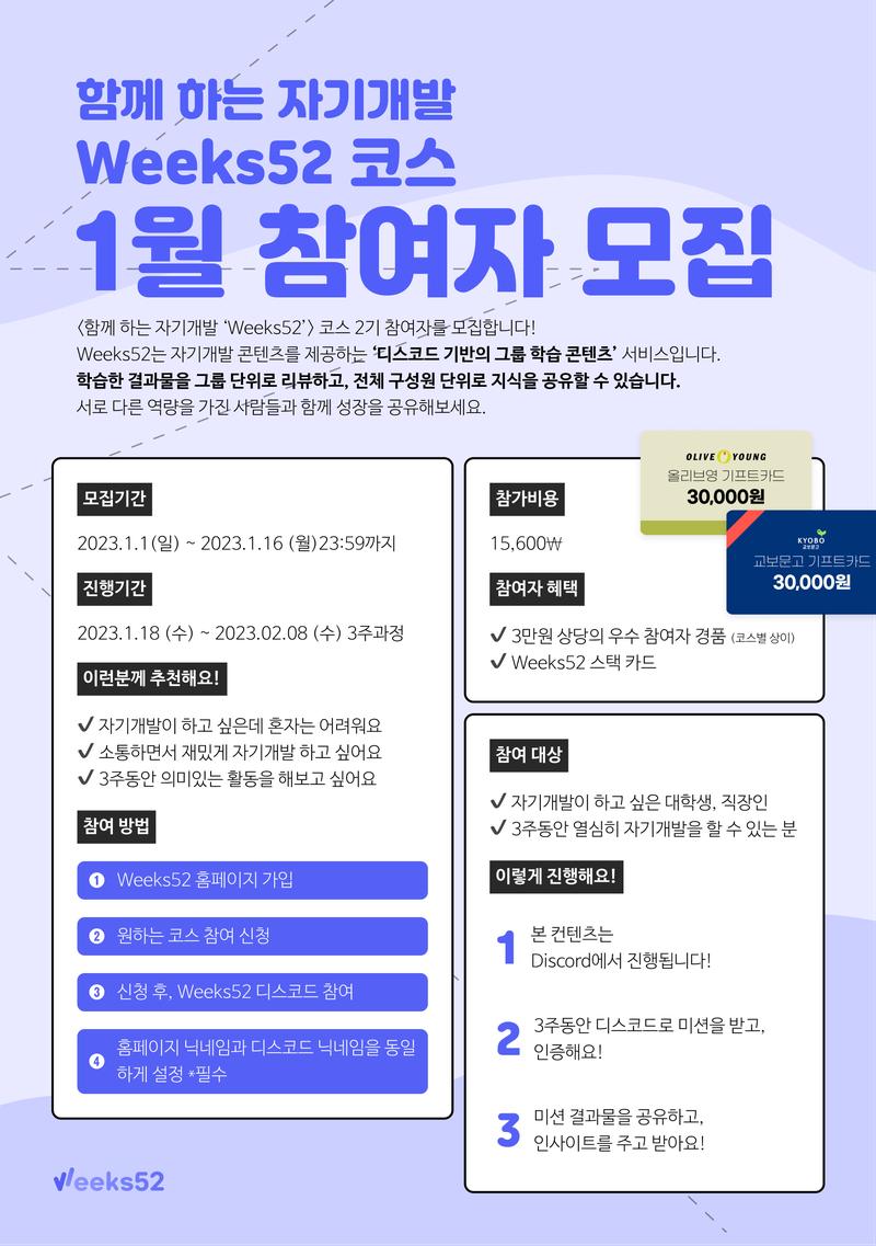 📝모집 개요 <함께 하는 자기개발 ‘Weeks52’> 자기개발 콘텐츠 1월 참여자를 모집합니다! Weeks52는 자기개발 콘텐츠를 제공하는 ‘디스코드 기반의 그룹 학습 콘텐츠’ 서비스입니다. 학습한 결과물을 그룹 단위로 리뷰하고, 전체 구성원 단위로 지식을 공유할 수 있습니다. 서로 다른 역량을 가진 사람들과 함께 성장을 공유해보세요.