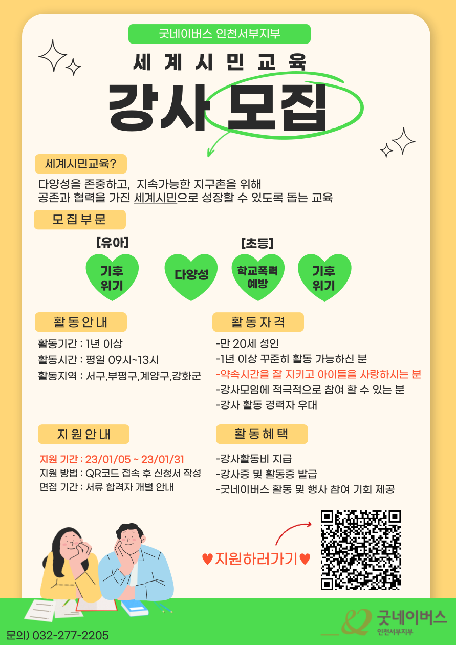 ■ 지원안내 지원기간 : 23/01/05 \~ 23/01/31 지원방법 : 구글폼 작성 후 제출 ↓↓↓↓↓지원하러가기↓↓↓↓↓ https://docs.google.com/forms/d/e/1FAIpQLSfpGSjuhBsDp-ORLo4KCQ4IWPD6GpN4fd6ZFrmRLU1GhO1VIQ/viewform?usp=sf_link 면접기간 : 서류 합격자 개별 안내 ■ 모집부문 [유아] -기후위기 교육 [초등] -다양성 교육 -학교폭력예방 교육 -기후위기 교육 ■ 활동안내 활동기간 : 1년 이상 활동시간 : 평일 09시\~13시 활동지역 : 서구,부평구,계양구,강화군 ■ 활동혜택 강사활동비 지급 강사증 및 활동증 발급 굿네이버스 활동 및 행사 참여 기회 제공 ■ 활동자격 -만20세 성인 -1년 이상 꾸준히 활동 가능한 분 -약속시간을 잘 지키고 아이들을 사랑하시는 분 -강사모임에 적극적으로 참여 할 수 있는 분 -강사 활동 경력자 우대 ■ 문의 굿네이버스 인천서부지부 (032-277-2205)