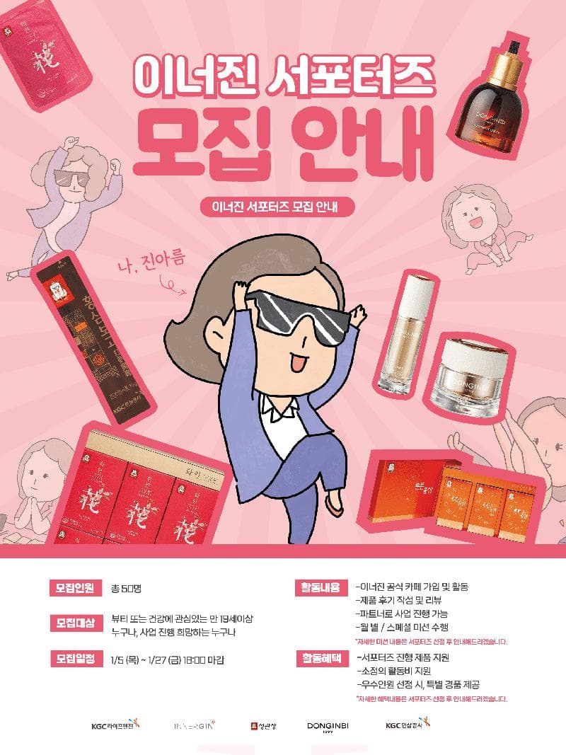 한국인삼공사의 자회사인 KGC라이프앤진에서 런칭한 신사업 이너진 비즈니스 서포터즈 모집을 진행하고 있습니다.