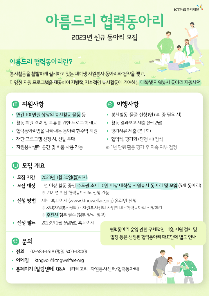 2023년 KT&G복지재단과 함께 할 신규 아름드리 협력동아리를 모집합니다! ▶ 대상 : 수도권 지역에서 봉사활동을 활발하게 진행하며, 1년 이상 운영 중인 활동회원 10인 이상으로 구성된 대학생 자원봉사 동아리 및 모임 ▶ 지원사항 1. 동아리별 연간 100만원 상당의 봉사활동 물품 등 지원 : 교구, 간식, 도서, 버스, 피자, 단체티, 공간대여, 기타 봉사활동 용품 등 2. 협력동아리임을 나타내는 동아리 현수막 제작 지원 3. 협력동아리 활동 회원 격려 및 교류를 위한 발룬치어링 프로그램 지원 : KT&G상상마당 예술 체험 프로그램, 동아리 세미나 장소 제공 등 4. 자원봉사센터의 볼런테인먼트 프로그램(국내 ․ 외 봉사 프로그램) 선발 우대 5. KT&G복지재단 자원봉사센터 장소 무료 개방 : 프로그램실 공간 사용 / 문구류, PC, 프린터 등 비품 사용 / 간식 지원 ▶ 신청방법 : KT&G복지재단 홈페이지 온라인 신청 (회원가입 및 로그인 필요) ▶ 문의 KT&G복지재단 자원봉사센터 (&터) 02-584-1618 / ktngvol@ktngwelfare.org ※ 기타 자세한 내용은 홈페이지 공지사항을 참고해 주시기 바랍니다.