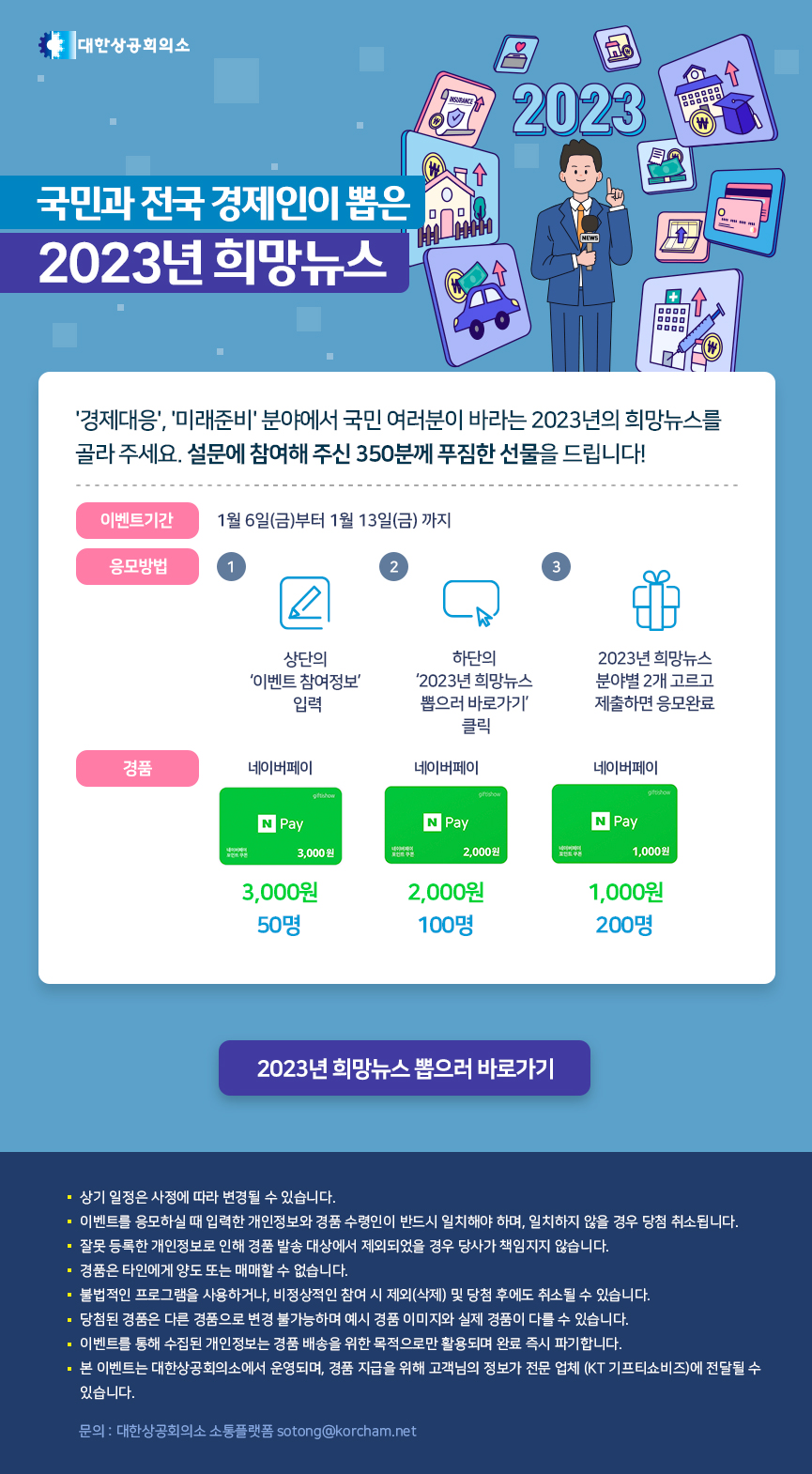 1) 대한상의 소통플랫폼에 회원가입 및 로그인 2) 정보마당 > 이벤트 > 2023년 희망뉴스 게시글에서 3) 상단의 '이벤트 참여정보' 입력 후 투표하셔야 경품 이벤트에 응모됩니다. *당첨자 발표일 1월 17일(화)
