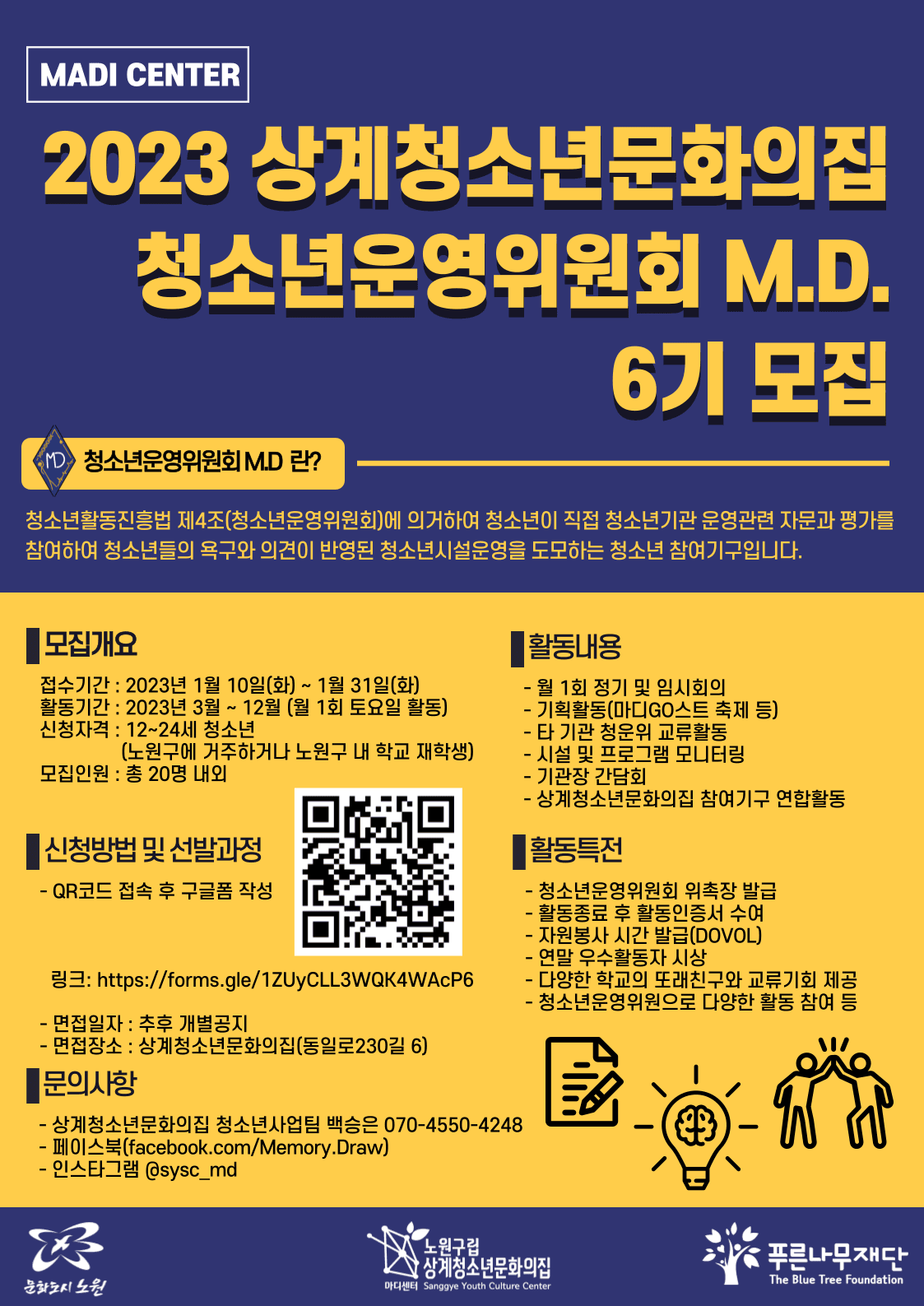* 문의 : 상계청소년문화의집 백승은 070-4550-4248 / 페이스북(청소년운영위원회 M.D)메세지, 인스타그램(@sysc_md) DM
