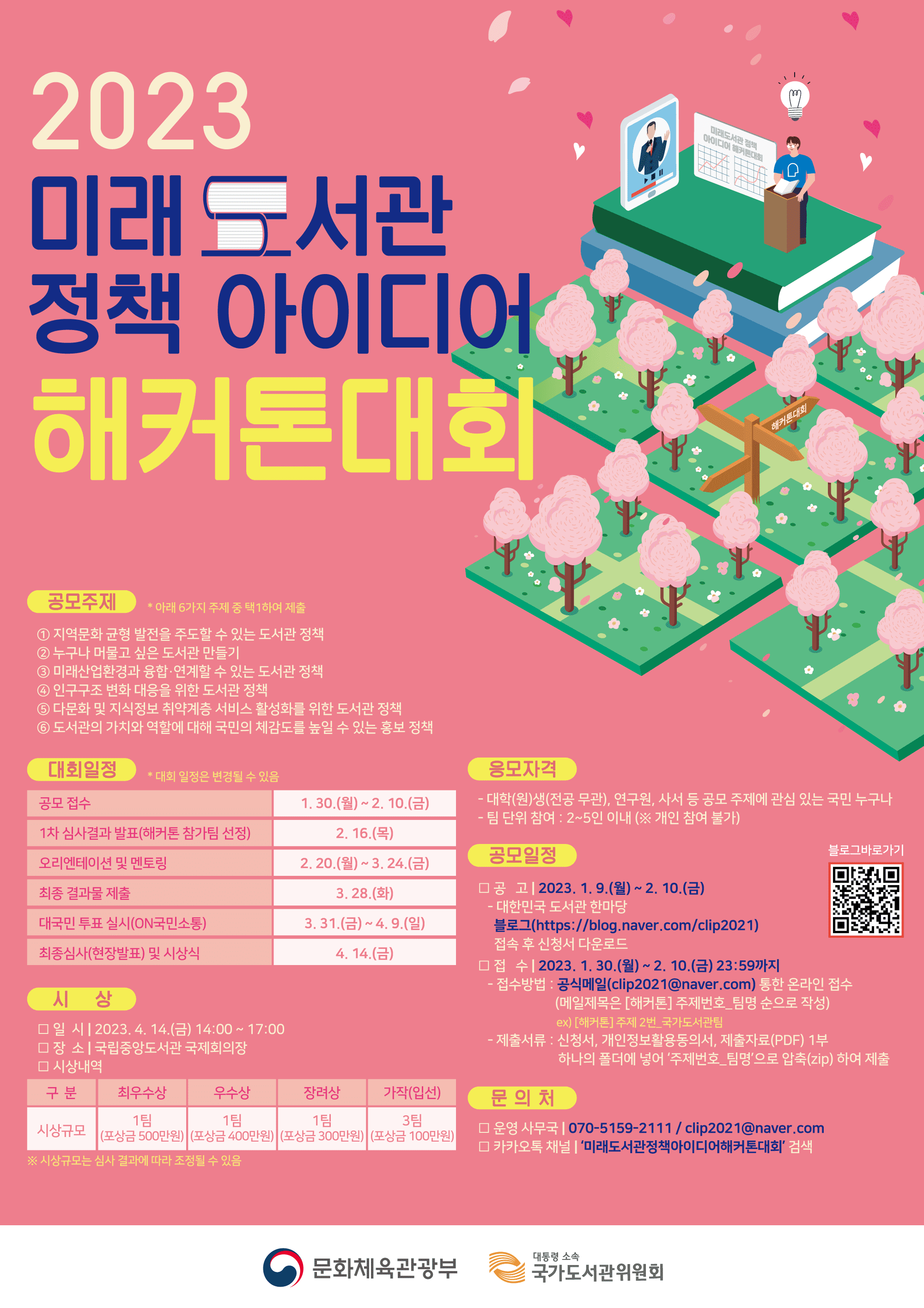 ● 공모개요 국가도서관위원회는 「제1회 도서관의 날」을 기념하고, 국민과 함께 지역문화 균형발전을 주도하고 국민의 삶의 질 향상에 대한 수요에 부응하는 도서관 정책을 만들어 나가기 위하여 「2023 미래도서관 정책 아이디어 해커톤 대회」를 개최하오니 관심 있는 분들의 많은 참여 바랍니다.
