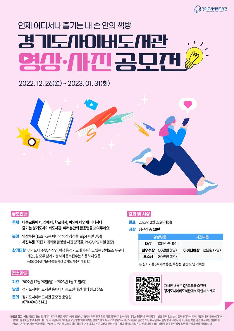 <경기도사이버도서관 영상∙사진 공모전 안내> “대중교통에서, 집에서, 학교에서, 야외에서 언제 어디서나 즐기는 경기도사이버도서관, 여러분만의 사용법과 활용법을 보여주세요!” ✅ 접수 안내 - 접수 기간 : 2022. 12. 26(월) \~ 2023. 01. 31(화) - 접수 문의 : 경기도사이버도서관 공모전 운영팀 (070-4040-5141) - 접수 방법 : 참가작과 함께 첨부된 ‘경기도사이버도서관 영상사진 공모전 동의서’를 meatyk@gmail.com 로 이메일 전달 * 참고사항 : 1.메일 제목, 참가작 파일, 공모전 동의서 파일명은 반드시 ‘공모 부문_신청자 이름(팀명)’으로 저장해 주시기 바랍니다. *참가작 파일명 예시)영상부문_김도서.mp4 / 사진부문_이전자.jpg * ‘경기도사이버도서관 영상사진 공모전 동의서’ 예시) 동의서는 파일명에 동의서 표기 - 영상부문_김도서(팀명)_동의서.jpg 2.참가는 영상, 사진부문 중 1개의 부문만 응모가 가능합니다. (중복 수상 당선 시 수상 취소) 3.참가작은 접수메일에 첨부된 파일 중 영상이나 이미지 파일 1개만 인정되며, 다수의 콘텐츠 첨부 시 접수취소 됩니다. 4.팀의 경우 팀원 전원이 ‘경기도사이버도서관 영상사진 공모전 동의서’를 작성해 첨부해 주셔야 합니다. * ‘경기도사이버도서관 영상사진 공모전 동의서’는 출력하여 본인이 직접 공란작성과 날인 후 사진을 찍거나 스캔본으로 첨부 ✅ 공모 안내 - 공모 분야 ①영상부문 : 15초 \~ 3분 이내의 영상 창작물 *1920*1080(pixel)이상 크기의 영상으로 16:9 혹은 9:16비율의 mp4 파일 ②사진부문 : 직접 카메라로 촬영한 사진 창작물 * 2000*3000 (pixel)이상의 크기의 jpg 혹은 PNG 파일 * 포토샵 등의 후보정(색상 교정만 가능)을 했을 경우 수상 시 원본 이미지 제출 가능하여야 함 * 지정서식 외 추가 제출 자료는 심의에 반영하지 않으며, 파일 양식에 어긋나거나 공모전 동의서 미 첨부 시 응모가 되지 않습니다. - 참가대상 경기도 내 주부, 직장인, 학생 등 경기도에 거주하고 있는 남녀노소 누구나 * 개인, 팀 모두 참가 가능하며 중복접수 불가 * 응모 접수일 기준 주민등록상 경기도 거주자에 한함 ✅ 결과 및 시상 - 결과 발표 : 2023년 2월 22일 (예정) - 시상 : 당선작 총 10편 ①영상부문 : 대상 100만 원(1명) / 최우수상 50만 원(1명) / 우수상 30만 원(1명) ②사진부문 : 아이디어상 10만 원(7명) - 심사기준 : 주제적합성\, 독창성\, 완성도 및 기획성
