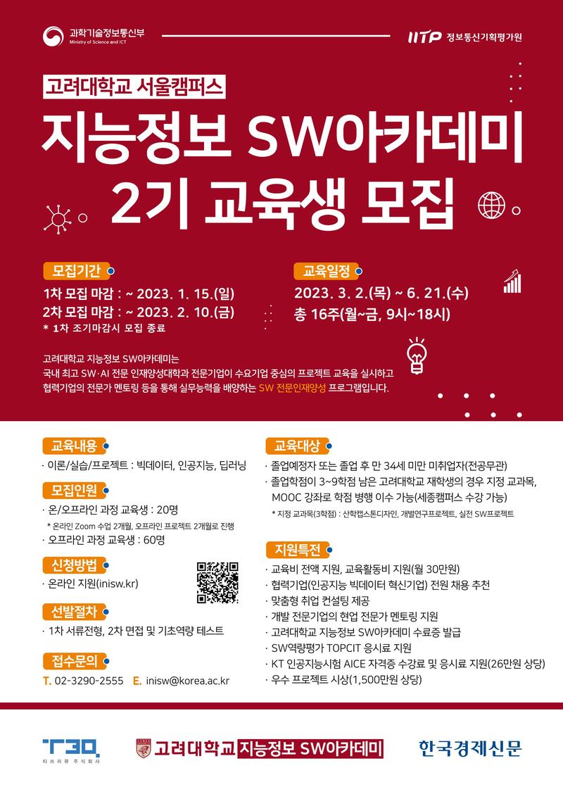 고려대학교 지능정보 SW 아카데미에서는 SW 기술, 인공지능 역량을 갖춘 융합형 데이터 전문 SW 인재를 양성하기 위해 2기 교육생을 모집하고 있습니다. 기본기를 탄탄하게 다질 수 있는 이론 및 실습 교육부터 실무능력을 키울 수 있는 프로젝트 과정까지 준비하였으니 많은 관심과 적극적인 참여 부탁드립니다!