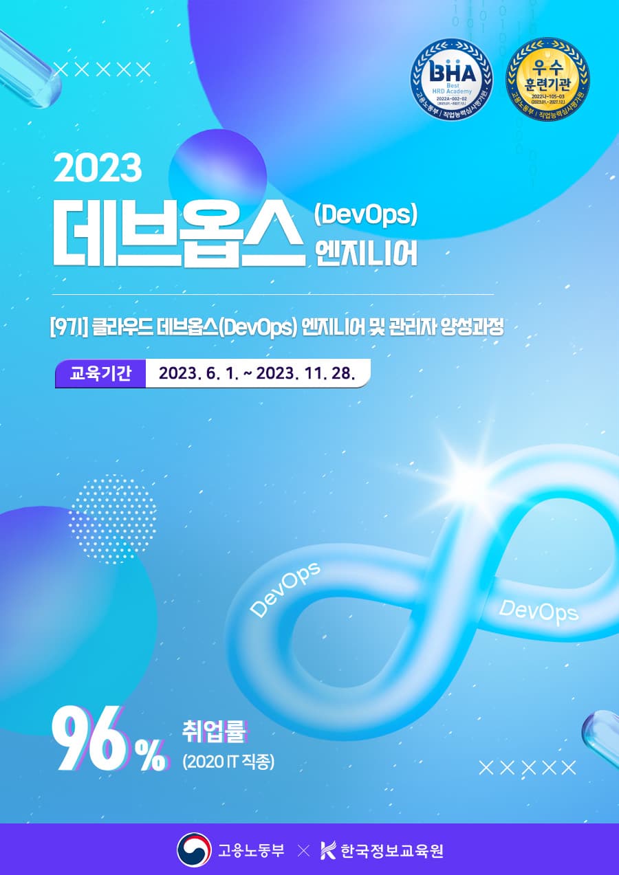 ○ 신청기간 : 2023년 03월 20일 월요일 \~ 2023년 06월 08일 목요일 ○ 교육기간 : 2023년 06월 01일 목요일 \~ 2023년 11월 28일 화요일 ○ 교육대상 : 교육과정을 성실히 이수하여 데브옵스 및 클라우드 분야 취업 희망 국민 누구나 ○ 신청방법 : 홈페이지 또는 방문 접수 ○ 담당자 이메일 : kyoungwon199@naver.com ○ 담당자 전화번호 : 02-855-9611