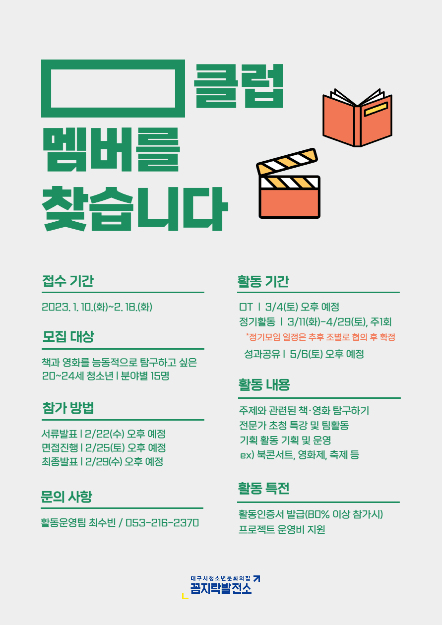 모집대상: 책과 영화를 능동적으로 탐구하고 싶은 20\~24세 청소년 ㅣ 분야별 15명