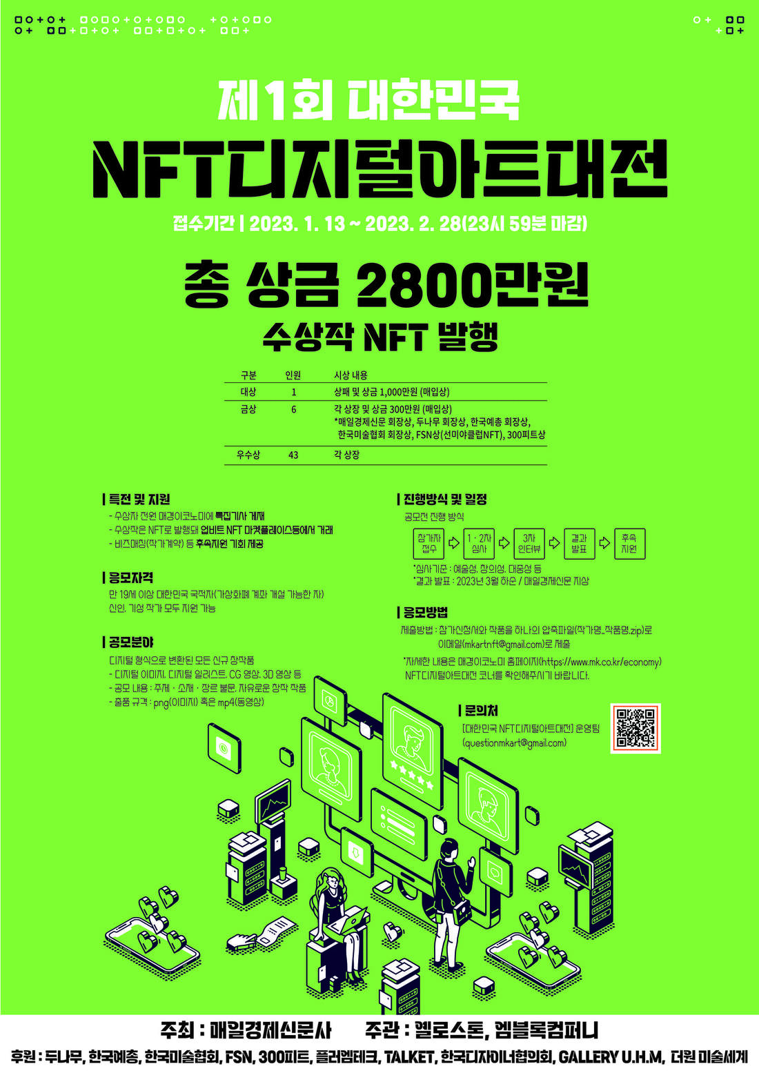 ● 공모개요 디지털아트 우수 작가 발굴 및 육성을 위한 [제1회 대한민국 NFT 디지털아트대전]이 21세기 디지털 문화 선도와 FINE ART 패러다임 전환기의 주인공이 될 창작자를 기다립니다. 본 공모전은 매일경제신문사가 개최합니다. 관심 있는 분들의 많은 참여 바랍니다.