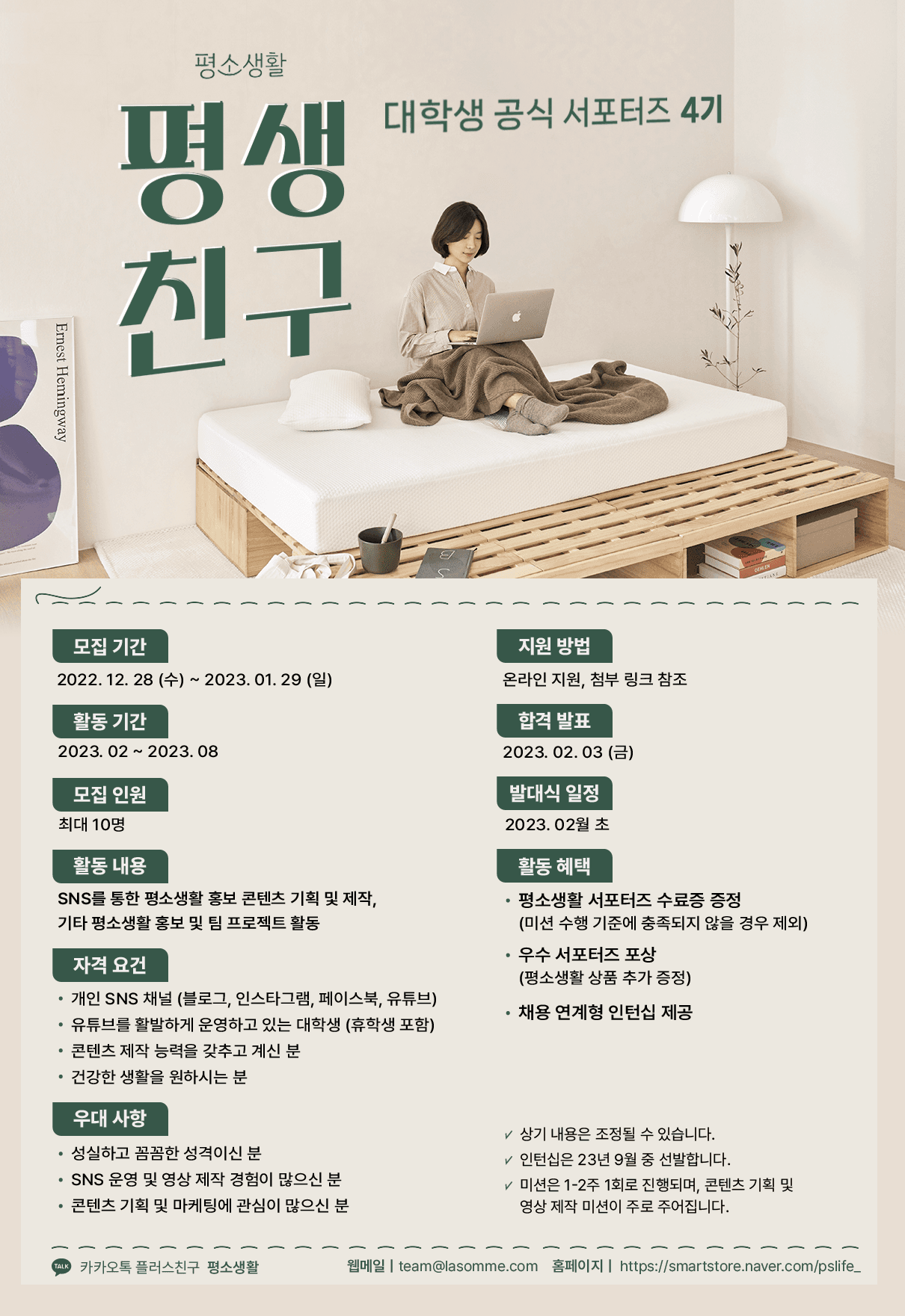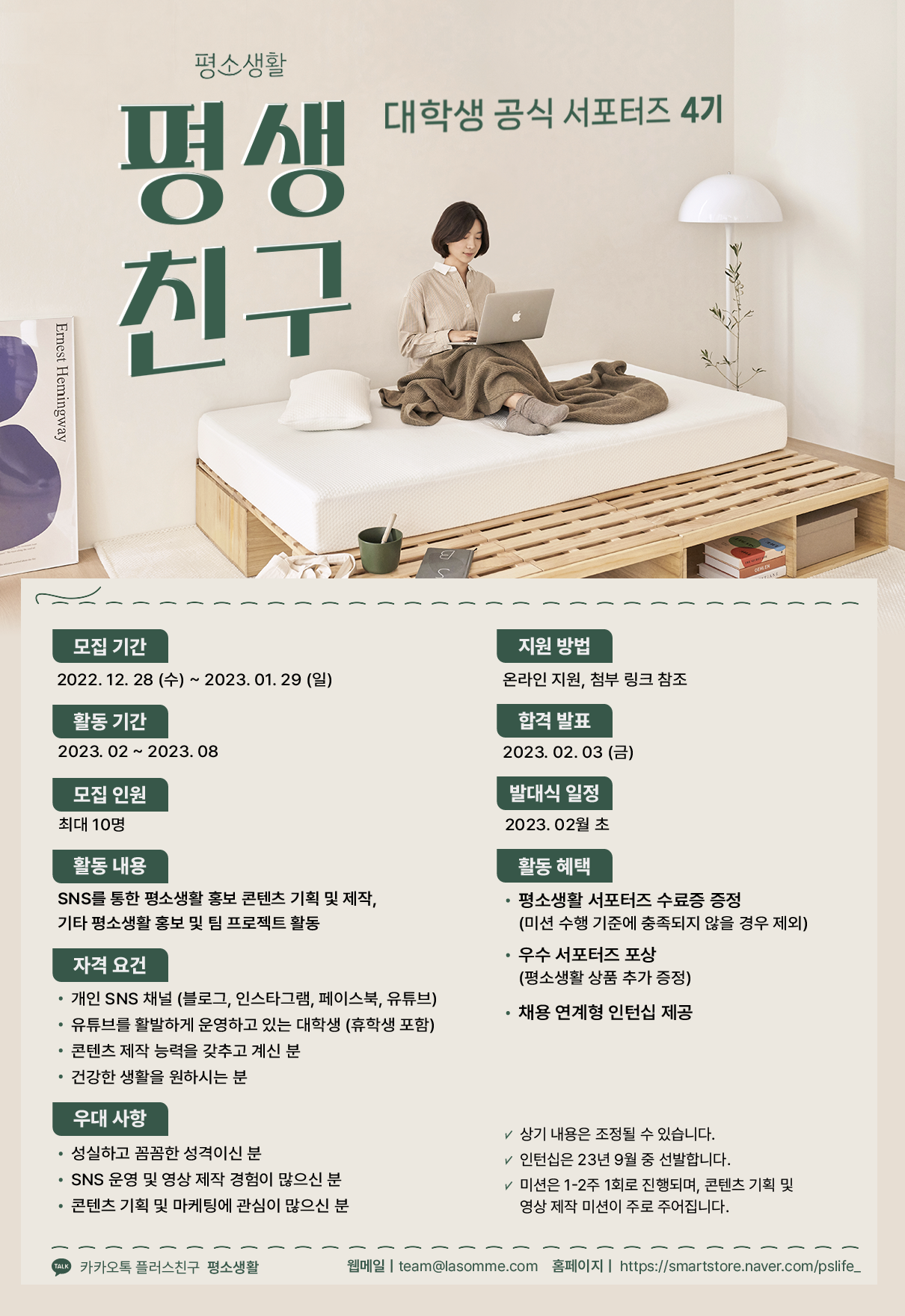 안녕하세요. 평소생활 공식 서포터즈 '평생친구' 4기에 지원하신 여러분 환영합니다. 라이프스타일 브랜드 평소생활은 매일매일의 작은 습관과 생활의 개선이 삶을 더 건강하고 풍요롭게 만든다고 믿습니다. 누구나 부담 없이 건강하기를 바라는 마음으로 시작한 평소생활, 지금부터 함께 도전해보아요!