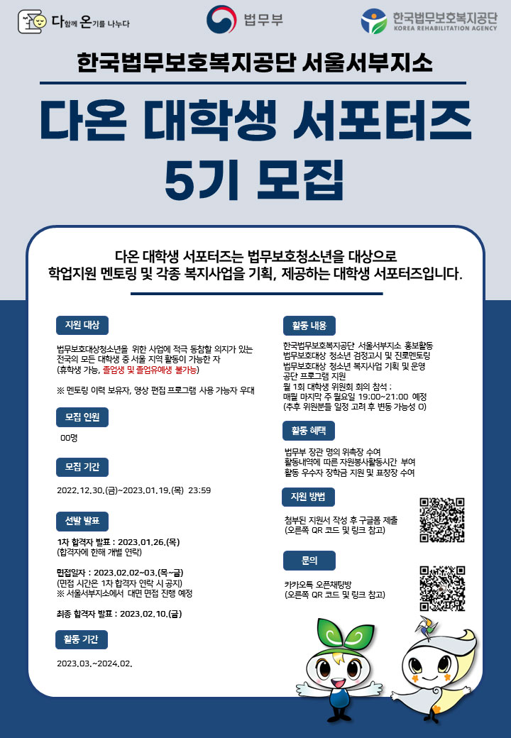 2023년을 맞아, 다온과 함께 세상에 온기를 나눌 신입 대학생 보호위원을 위촉하고자 하오니 상기 포스터의 내용을 참고하시어 많은 지원 부탁드립니다.