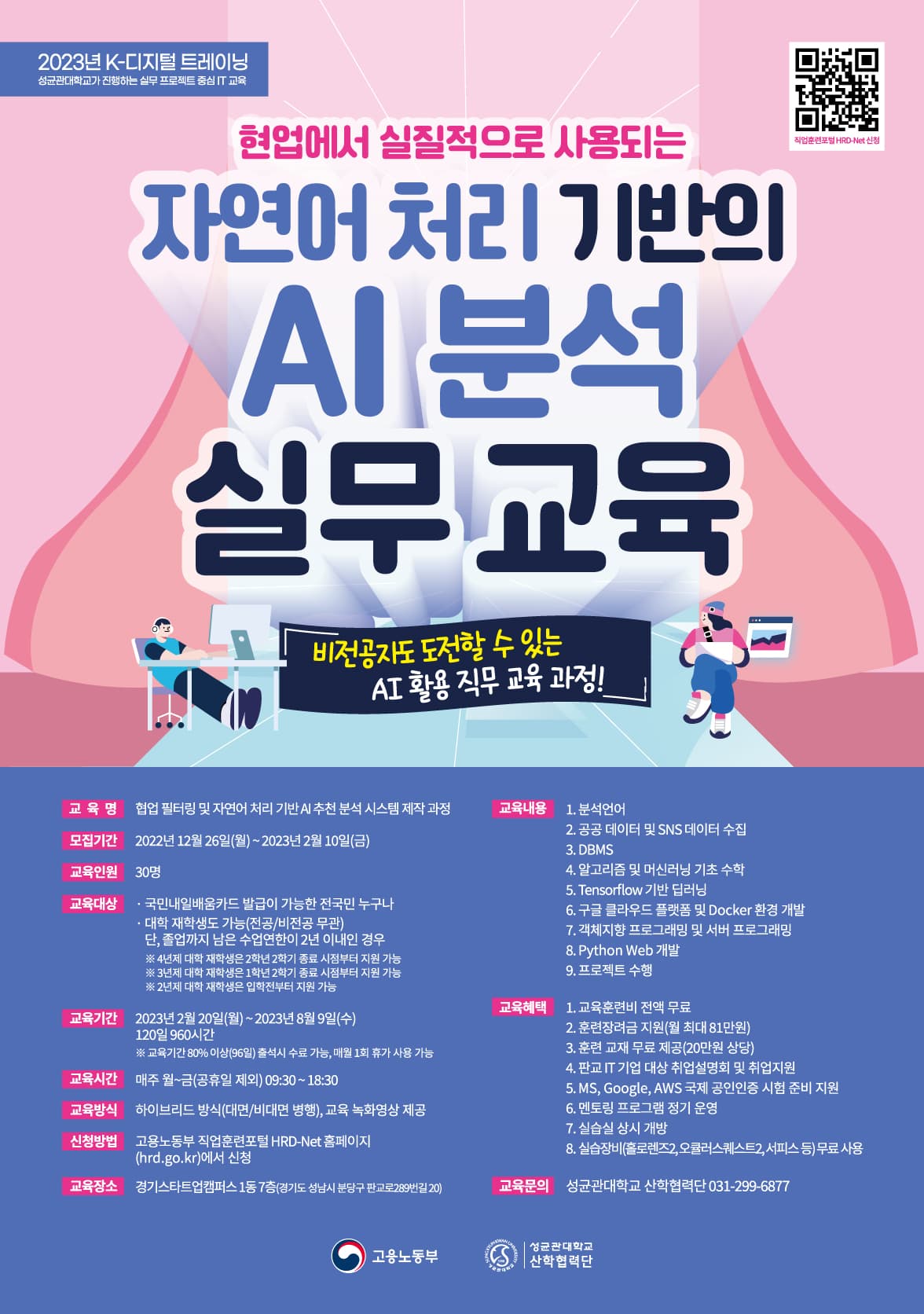 ✅ 모집기간 : 2022년 12월 26일(월) \~ 2023년 2월 10일(금) ✅ 교육기간 : 2023년 2월 20일(월) \~ 8월 9일(수) \| 120일 960시간 (80% 이상 출석시 수료 가능) ✅ 교육시간 : 매주 월\~금 \| 09:30 \~ 18:30 \| 대면/비대면 선택 및 조정 가능 ✅ 교육 인원 : 30명