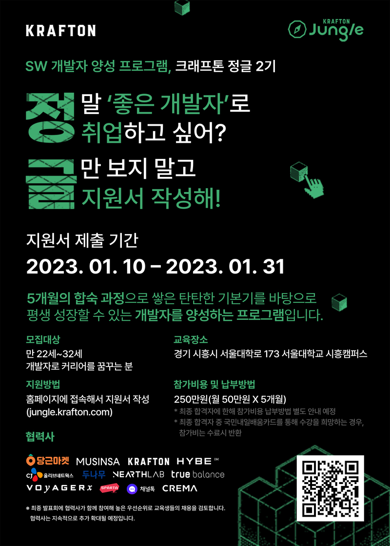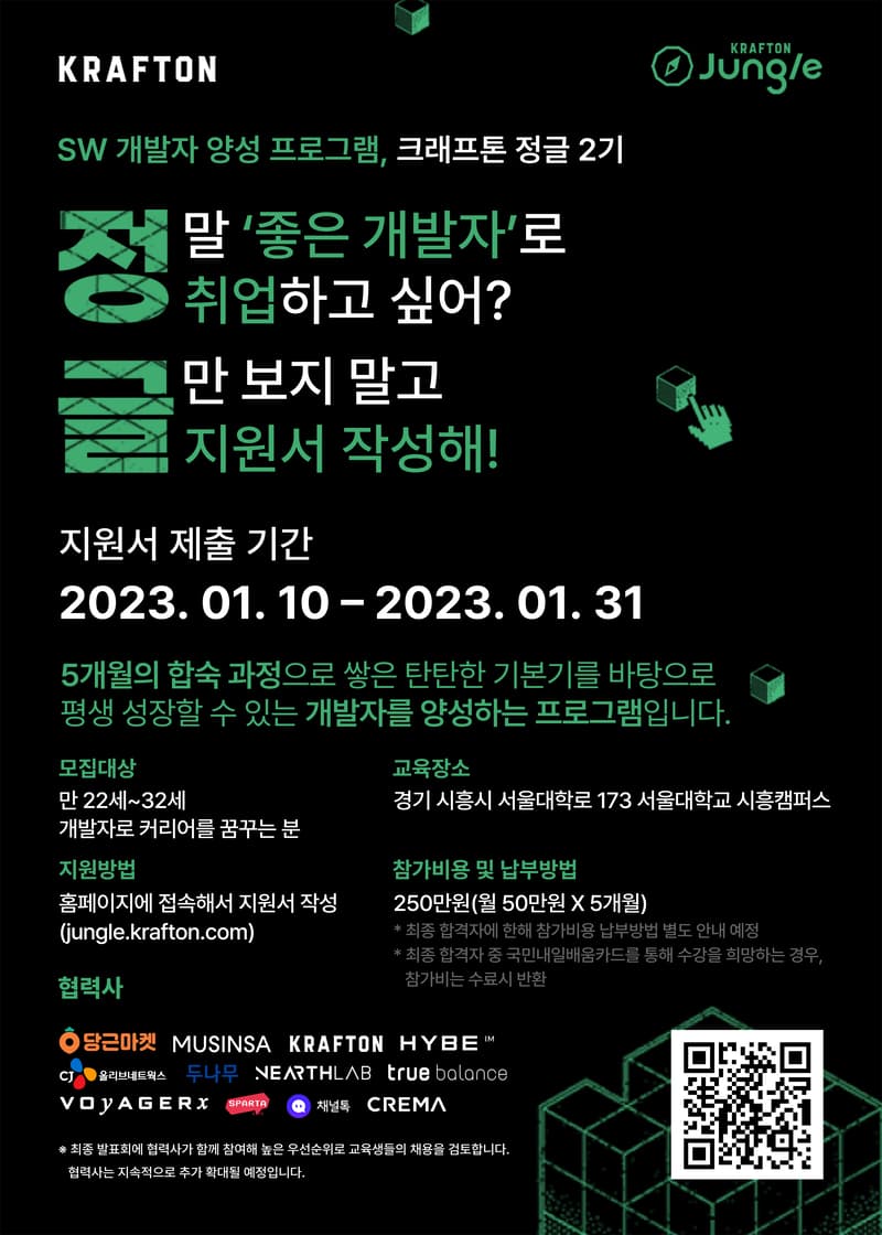 ※ 협력사 : 크래프톤, 보이저엑스, 팀스파르타, 니어스랩, 밸런스히어로, 채널코퍼레이션, 당근마켓, 두나무, 크리마, 하이브IM, 무신사, CJ올리브네트웍스 등