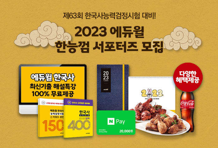 🔥 참여 혜택 1. 참여자 전원 1) 에듀윌 한국사능력검정시험 기출문제 해설특강 2) 2023 에듀윌 다이어리&캘린더 3) 에듀윌 한국사 키워드 150제 실물&합격 당락 400제 PDF(비매품)