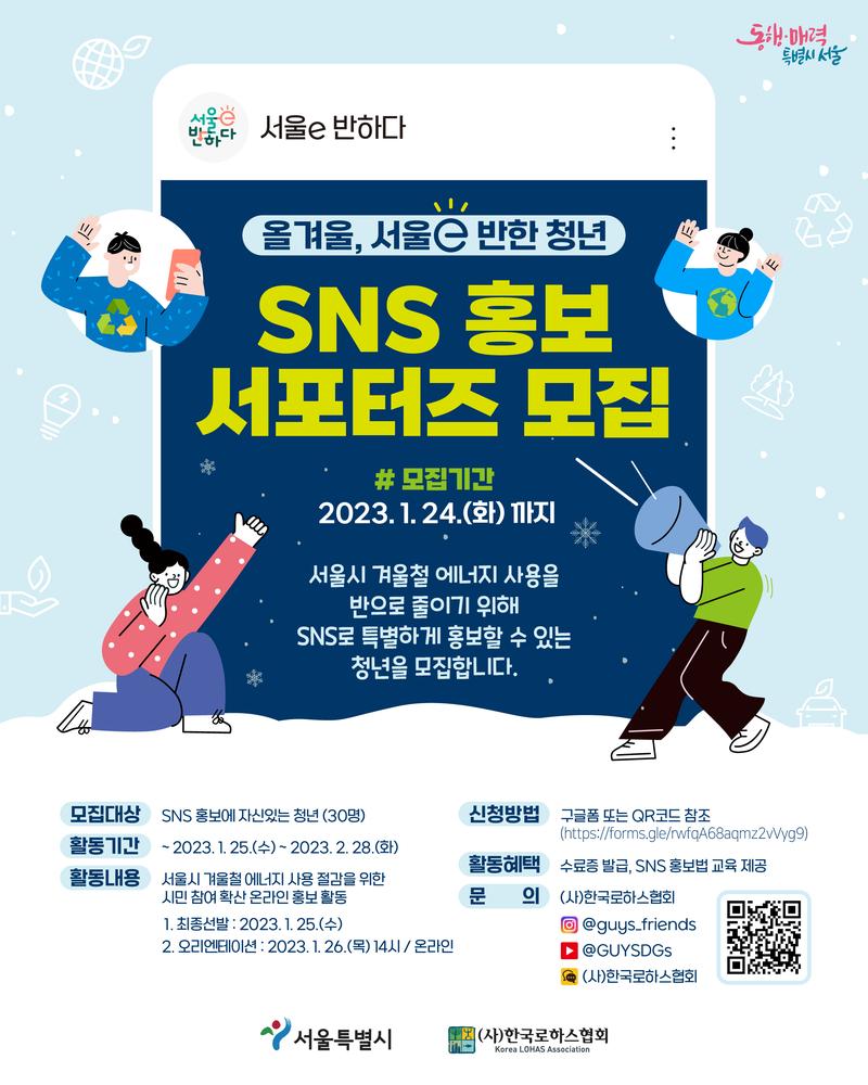 서울시 겨울철 에너지 사용을 반으로 줄이기 위해 SNS로 특별하게 홍보할 수 있는 청년을 모집합니다.