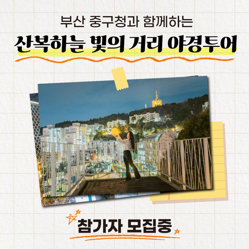 부산 중구청과 함께하는 산복하늘 빛의거리 야경투어 참가자를 모집합니다👏🏻 부산 중구 영주하늘 전망대에서 부터 대청 공영주차장에 걸쳐진 빛의거리를 관람하고 구석구석에 숨겨진 포토존에서 가족, 연인, 친구와 함께 야간스냅촬영으로 추억을 남겨보세요🥰
