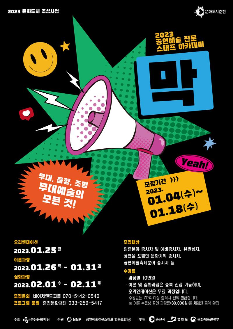 공연예술 스태프를 꿈꾸는 예비인력들의 성장의 장! 무대뒤 주인공이 되는 첫걸음! <2023 공연예술 전문 스태프 아카데미 막>에서 예비 공연예술 스태프를 모집합니다! 춘천문화재단은 문화도시 조성사업의 일환으로 문화도시 춘천 특화형 전문스태프 인력양성 프로그램을 운영하고 있습니다. 《2023년 공연예술 전문 스태프 아카데미 막》은 올해로 4회차를 맞이한 사업으로 공연예술 스태프계를 꿈꾸는 예비인력들의 성장의 장, 관련 분야 종사자들의 역량을 강화할 수 있는 체계적인 현장실무를 지원합니다. 평소 공연예술 전문 스태프의 활동에 관심 있던 관계자 여러분의 많은 관심과 참여 부탁드립니다.