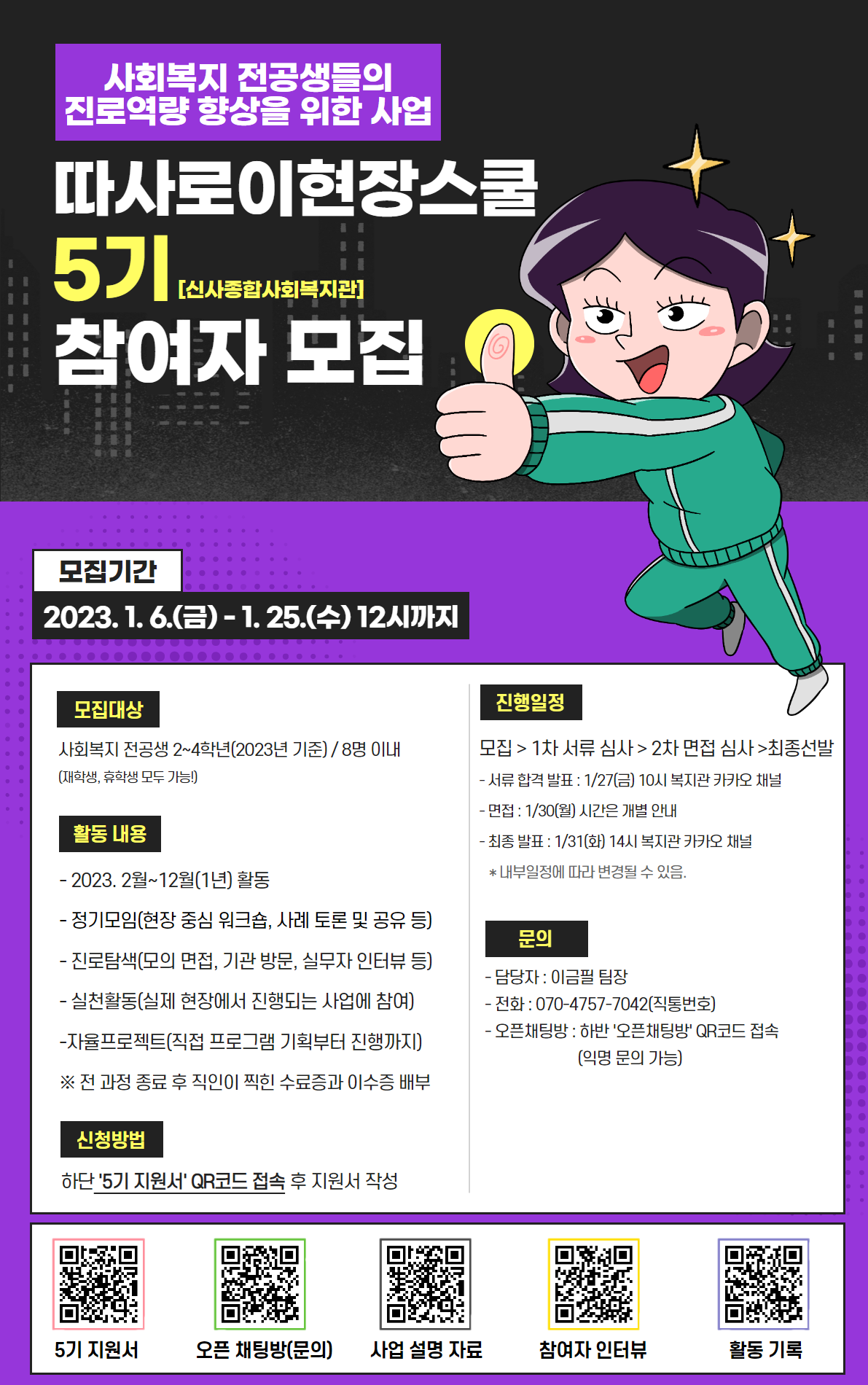 - 신청방법 : 홍보지 내 ‘5기 지원서’ QR코드 촬영 후 지원서 작성