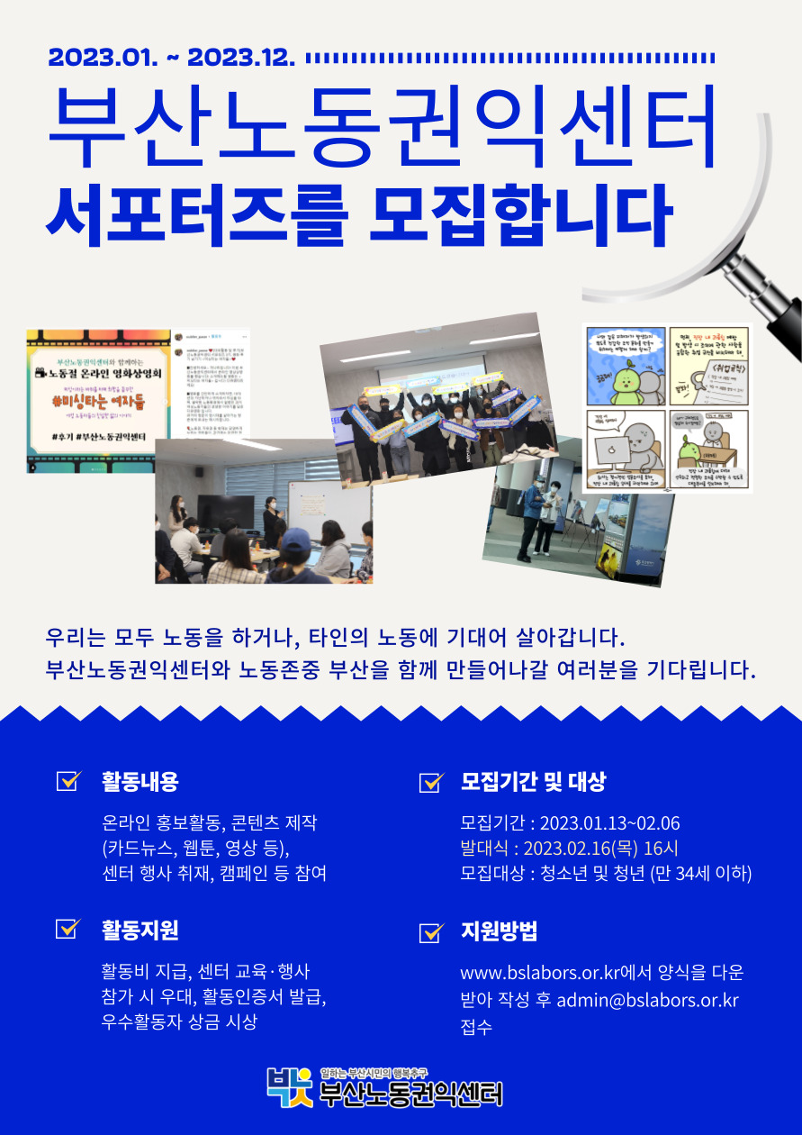 제 4기 부산노동권익센터 서포터즈를 모집합니다. 서포터즈는 노동과 관련한 문제들을 재기발랄한 콘텐츠를 통해 부산시민에게 알리고, 노동교육·캠페인·행사 등을 취재하는 활동을 2023년 한 해 동안 하게 됩니다. 센터와 함께 할 제 4기 서포터즈 단원이 되어주세요!