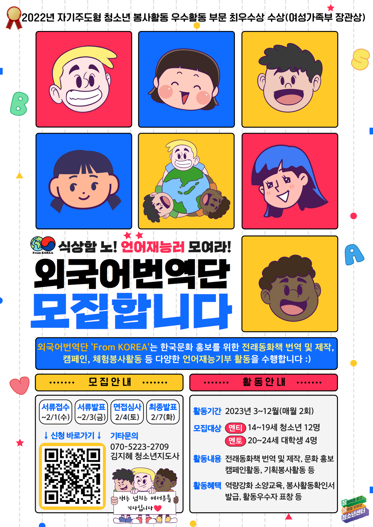 [2023년 잠실청소년센터 외국어번역단 'From KOREA' 단원 모집] 식상한 봉사활동은 가라! 나만의 재능과 능력을 마음껏 뿜뿜 살릴 수 있는 언어재능러 모여라!!! 2023년 외국어번역단 'From KOREA' 2기 단원을 모집합니다 <활동일정> - 활동기간: 2023.02.\~12.(10개월) 월 2회 - 모집대상: 14\~19세 멘티 청소년 12명 / 20\~24세 멘토 대학생 및 성인 4명 - 활동내용: 전래동화책 번역 및 제작\, 문화홍보 캠페인활동\, 기획봉사활동 등 - 활동혜택: 역량강화 소양교육\, 우수활동자 표창\, 외부봉사 참여 기회 제공\, 봉사활동확인서 발급(활동별 상이) 등 <지원자격> - 14세 이상 청소년 및 성인으로 동화책 한-영 번역실력을 갖춘 자 - 영어회화에 관심이 많고 소통이 원활한 자 - 아래 내용 중 하나라도 해당되는 자 1) 공인영어 성적: 토익 850 이상, 토플 95 이상, 아이엘츠 7 이상, 텝스 750 이상 2) 유학생일 경우: 재학증명서, 졸업증명서 등 3) 영어권 국가 시민권자일 경우: ID카드 사본 4) 기타 이에 준하는 수준의 언어능력을 증빙할 수 있는 객관적인 서류 등 ★ 공인 서류가 없어도, 해당 수준을 확인할 수 있는 간단한 자기소개 포트폴리오 제출 가능 <모집일정> - 모집기간: \~1/31(화) - 서류발표: 2/3(금) - 면접심사: 2/4(토) ※ 서류합격자에 한해 개별통보 - 최종선발: 2/8(수) - 사전 OT: 2/18(토) ※ 필수참석 <신청방법> https://forms.gle/e7dscbyZUpk3UhwS7 <기타문의> - 070-5223-2709 김지혜 청소년지도사 - 카카오채널 '잠청센' 1:1 문의