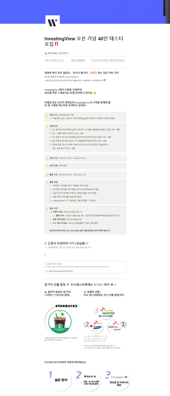 - \ 이벤트는 InvestingView 앱 서비스 오픈 기념 고객 (이하 “테스터”) 이 직접 사용해보고 제안하는 장을 마련하여 오류 발견 및 수집, 개선 적용하여 품질을 강화하기 위한 목적을 지니고 있습니다.