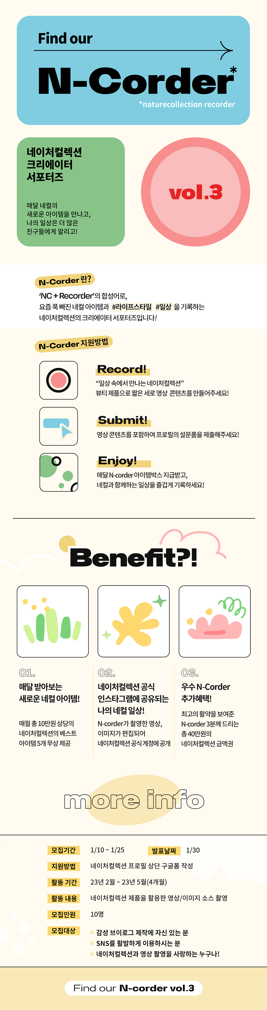 **N-Corder 최종** 합격자 발표는 "2023년 1월 30일(월)"에 네이처컬렉션 인스타그램 스토리 개별 DM으로 안내드릴 예정이에요. (*발표 일정 변동 있을 시 네이처컬렉션 인스타그램을 통해 사전 공지 예정) **더 궁금한 사항은, DM으로 보내주세요!** 👉💚인스타그램 바로가기 https://www.instagram.com/naturecollection_official/