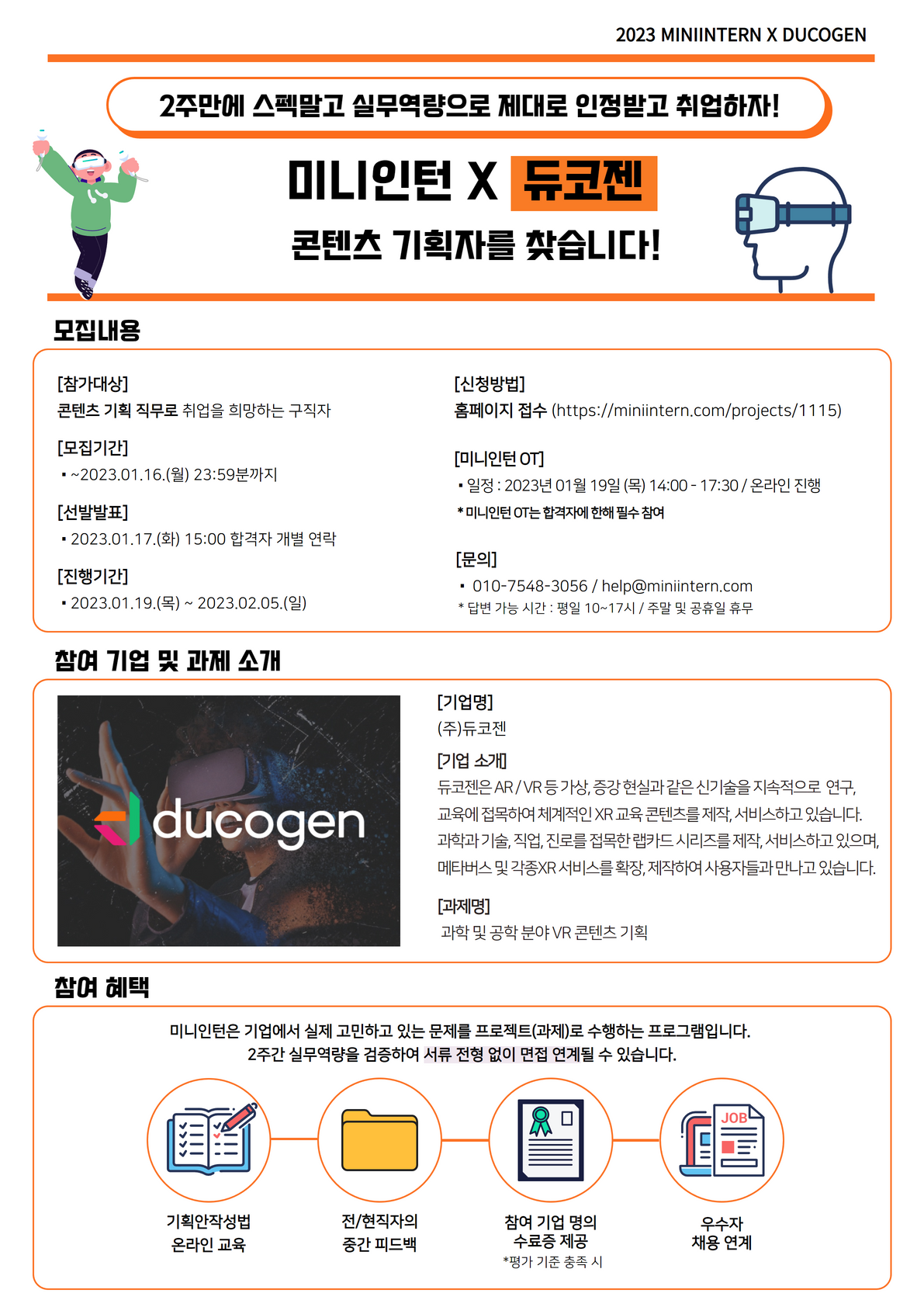 ▶모집 대상 - 콘텐츠 기획에 관심이 있는 분 - 기획 관련 실무 경험을 쌓고 싶으신 분 - 이론이 아닌\, 실무 지식을 얻고 싶으신 분 - 기업의 실무 프로젝트를 통한 포트폴리오 제작을 원하시는 분 ▶과제 수행 기간 2023.01.19(목) \~ 2023.02.05.(일) ▶미니인턴 OT일정 (필수참여) 2023.01.19.(목) 14:00 \~ 17:30 ▶미니인턴 OT 교육 내용 - 미니인턴 오리엔테이션 - 기업 소개 및 과제 안내 - 기획안 작성법 - Q&A 및 마무리 ▶개별 과제 소개 (OT 후 2주간) 과학 및 공학 분야 VR 콘텐츠 기획