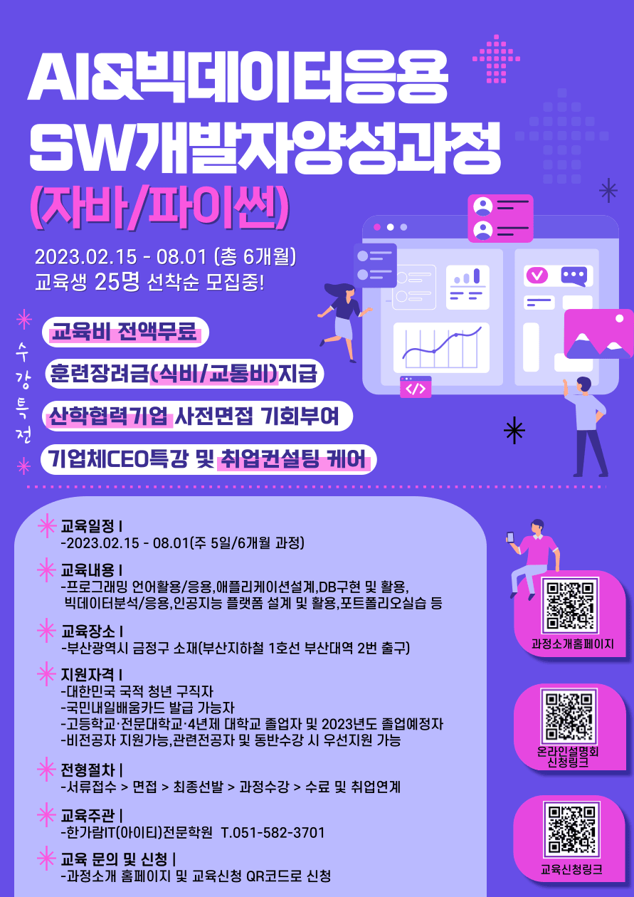 비전공자도 기초부터 교육 가능한 AI&빅데이터응용 SW개발자 양성과정 교육생을 모집합니다. 많은 관심과 지원 부탁드립니다!