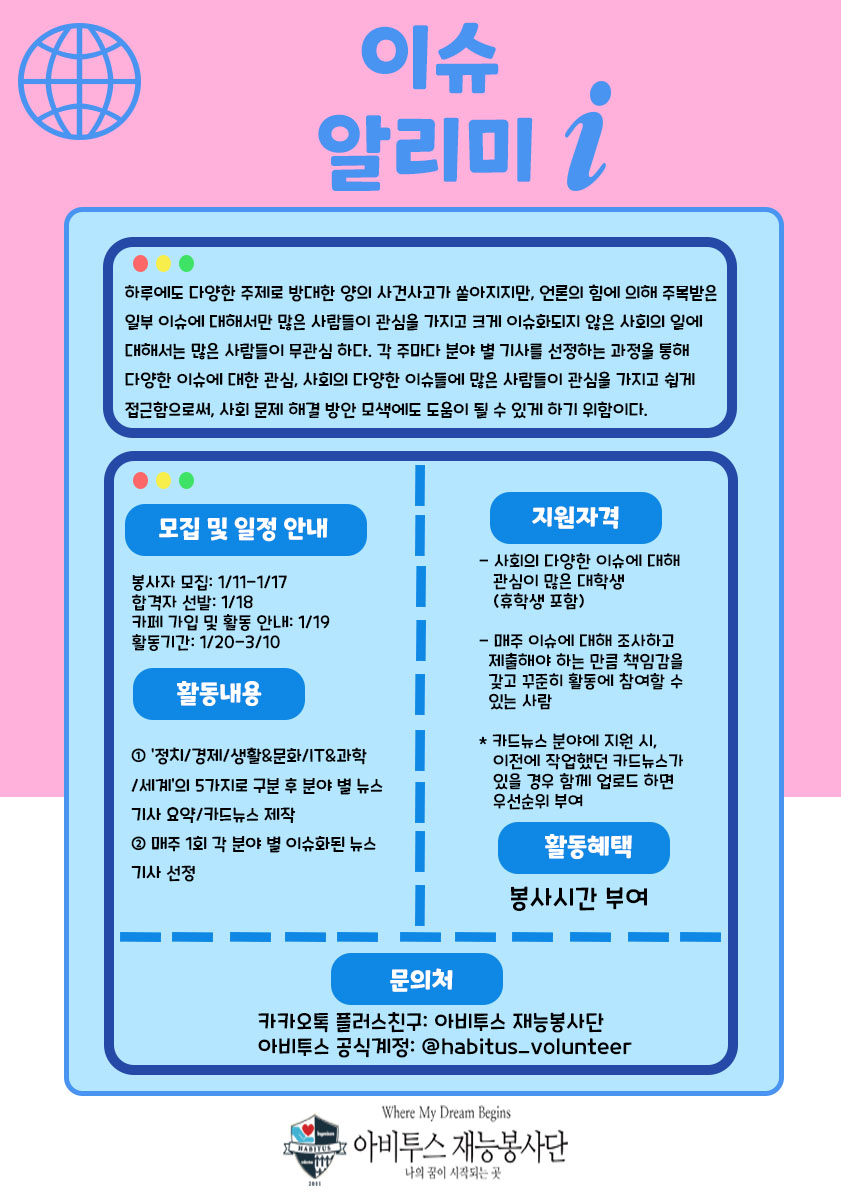- 기사 가공 및 카드뉴스 제작 기회(제작된 카드뉴스는 아비투스 인스타그램에 업로드 될 예정)