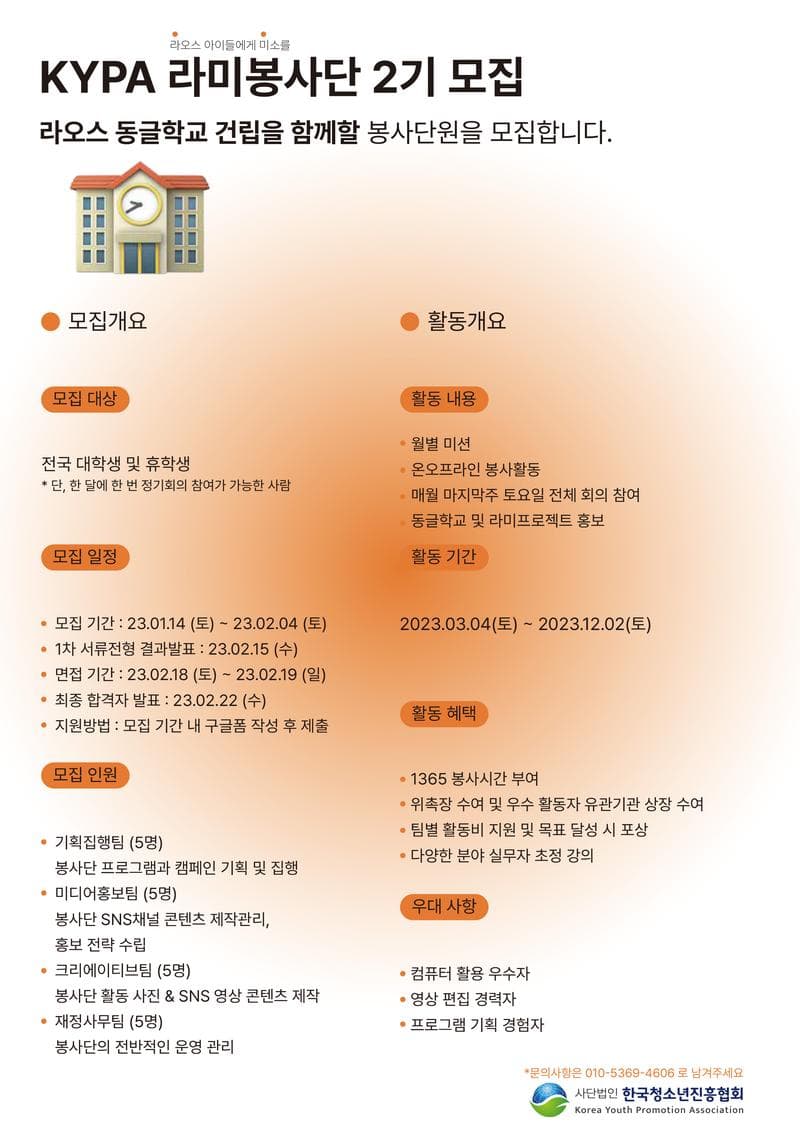 한국청소년진흥협회 KYPA에서 [라미봉사단 2기]를 모집합니다. KYPA는 라오스의 교육사업을 활성화하고 나눔을 실천하기 위해 2021년, [라미 프로젝트]를 시작했습니다 그 중 [라오스 동글학교 이사장 모집 캠페인]은 라오스 비엔티안 지역에 분교로 세워질 동글학교의 건립을 위해 5,000명의 이사장을 모으는 것을 목표로 하고 있습니다. 동글학교는 수많은 점이 중심점에 옹기종기 모여 이루어진 ‘동그라미’에서 따온 이름으로, 학교를 중심으로 모인 학생들에게 평등한 교육 환경을 만들어주자는 의미로 지어진 이름입니다. 2023년 9월 2일 개교 예정인 동글학교는 라오스 초등학교 5년 전과정의 정규 교육 프로그램과 아이들의 학비, 교복, 선생님들의 월급, 교육기자재 구입비용까지 전액 무상으로 지원할 예정입니다. 2023년 9월 2일에 개교되는 동글학교에서 아이들이 꿈과 희망을 키워나갈 수 있도록 라미봉사단에 함께해주세요. 직접 팀을 선택하고, 프로그램을 기획/운영할 수 있기에 전공 연계성과 주체성이 높은 활동입니다. 많은 관심과 지원 부탁드립니다!