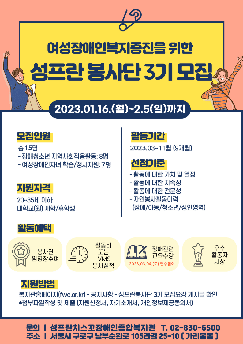 접수기간: 2023.01.16(월) \~ 2.5(일)까지 * 모집인원: 총 15명 - 장애청소년 지역사회적응활동: 8명 - 여성장애인자녀 학습/정서지원: 7명