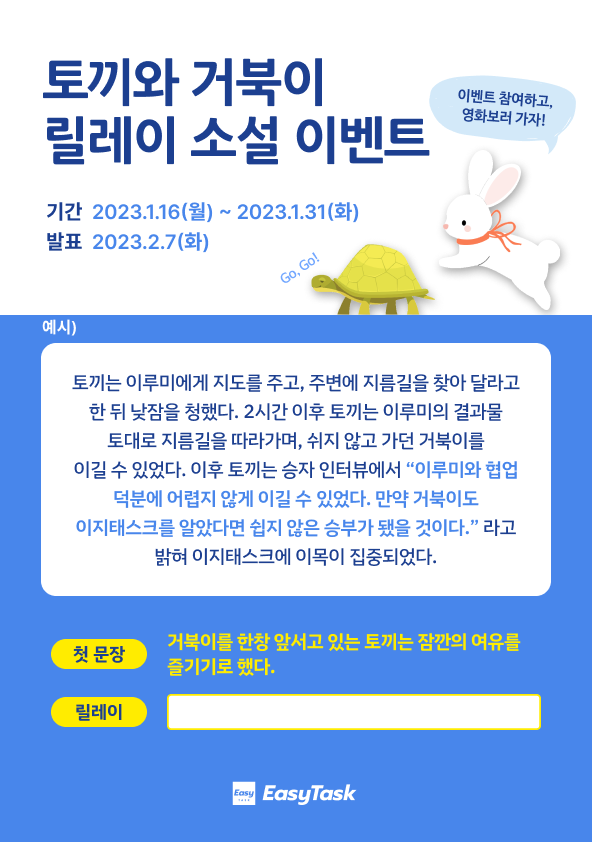 토끼는 거북이를 한창 앞서고 있어 잠깐의 여유를 즐기기로 했다. : ___________________________________ 이지태스크, 이루미, 협업 등의 이지태스크를 연상할 수 있는 키워드를 이용하여 소설을 연재해주셔야 합니다.(띄어쓰기 포함 200자-500자)