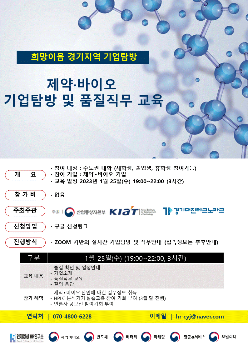 안녕하십니까? 인재양성 HR연구소입니다. 아래와 같이 ‘2022 제약바이오 기업탐방 및 품질직무 교육’을 안내드립니다. ■ 교육 과정 : 제약바이오 기업탐방 및 품질직무 교육 (비대면) ■ 모집 대상 : 수도권 소재 대학교 학생(재학생, 휴학생, 졸업생 포함) ■ 수강 비용 : 무료 ■ 교육 일정 : 2023년 1월 25일(수) 19:00\~22:00 / 온라인 ZOOM 방식 * 세부 내용 홍보포스터 참조(첨부 이미지 / 과정 신청 페이지에서도 확인 가능) ■ 참여 기업: 제약바이오 기업 (제테마, 파마리서치바이오) ■ 진행 방법: 온라인 ZOOM ■ 신청 방법: 구글 설문지 폼으로 신청 (https://forms.gle/xxzLhjPDVtkdDxk2A) ■ 참가 혜택: 1. 제약바이오 산업에 대한 실무정보 취득 2. HPLC 분석기기 실습교육 참여 기회 부여 (3월 말 진행) 3. 언론사 공모전 참여기회 부여