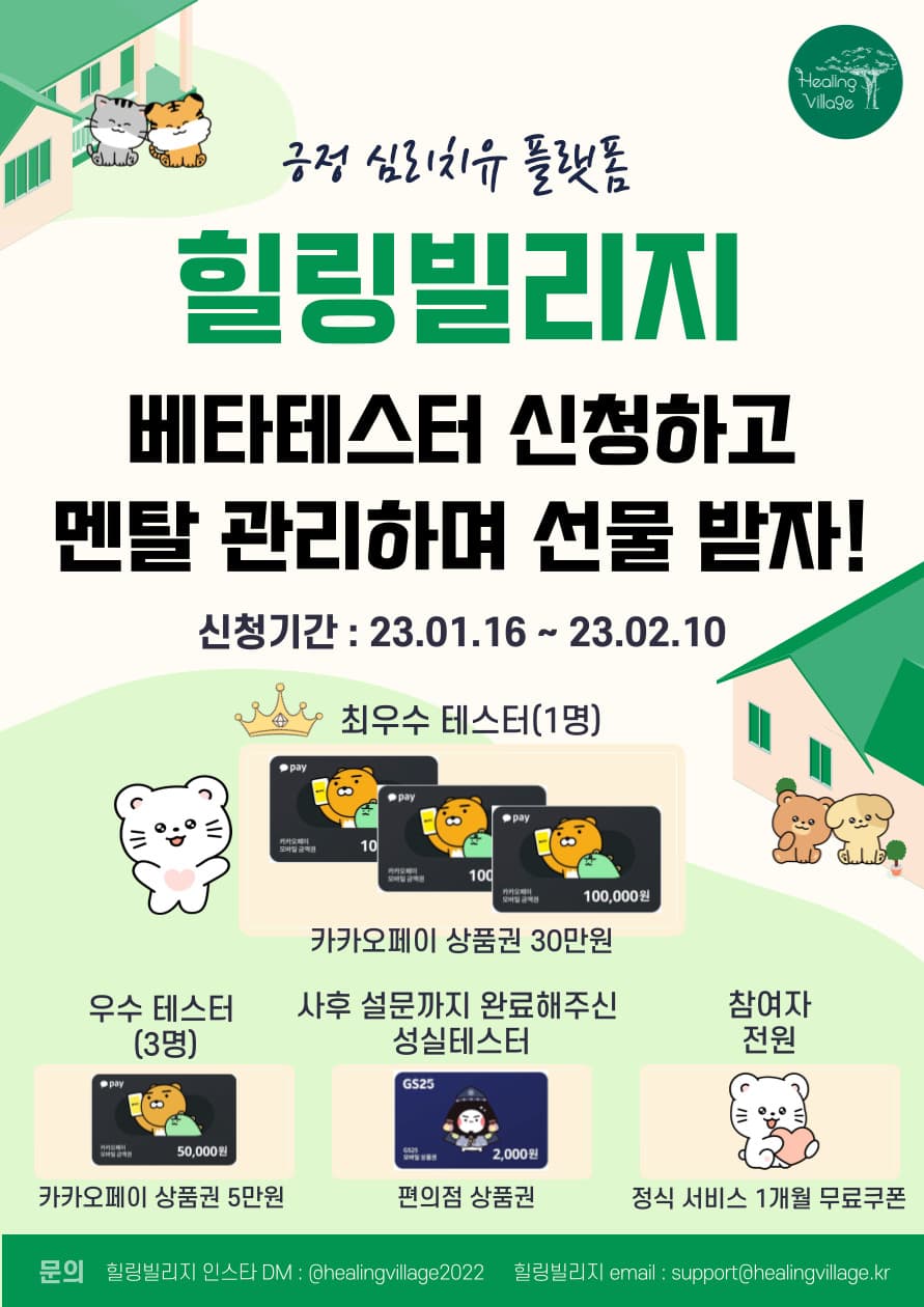 저희 힐링빌리지 베타테스터에 지원해주신 분들께 진심으로 감사드리며, 작성해주신 신청서에 따라 2월 15일부터 순차적으로 테스터 링크와 이용가이드를 송부드리겠습니다.